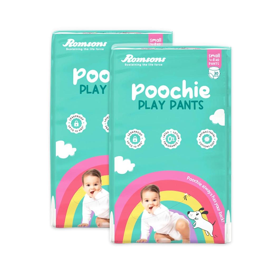 Romsons Poochie Play Pants Детский подгузник | Маленький размер | Защита от протекания до 10 часов | Комфортная посадка 360° | Подходит для 4-8 кг | Упаковка 2 шт.