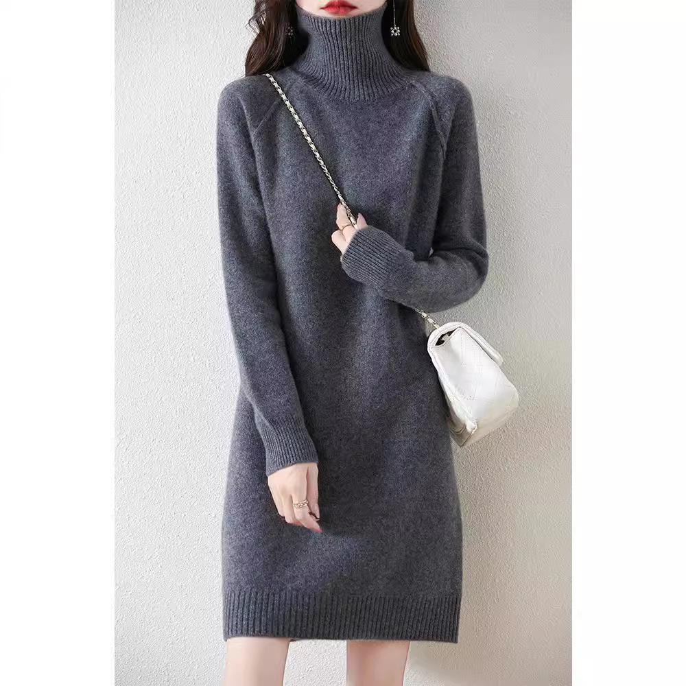 Женское утолщенное шерстяное платье с высоким воротником - средней длины, свободного кроя, со спущенным плечом, осенне-зимний стиль