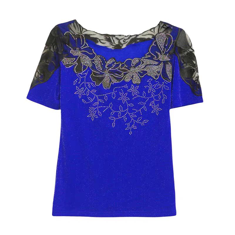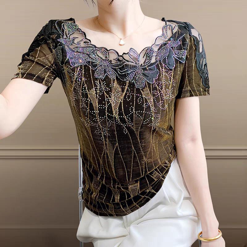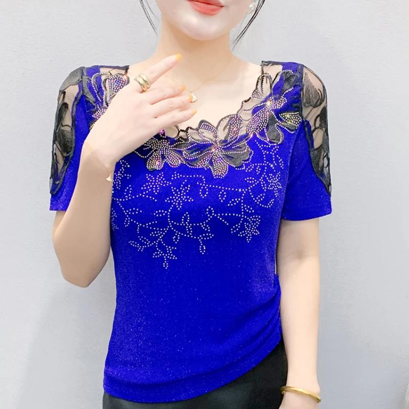 Летняя женская футболка Шикарная Сексуальная Кружевная Ажурная Вышивка Цветочная Лоскутная Сетка Топы Элегантный О-образный вырез Бриллианты Короткий рукав Футболки