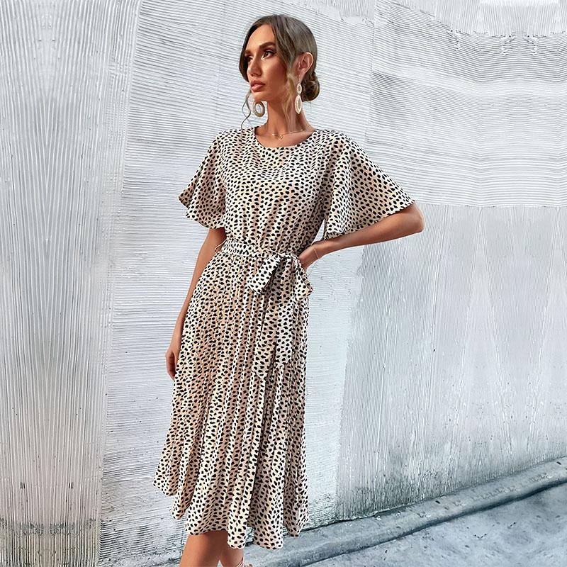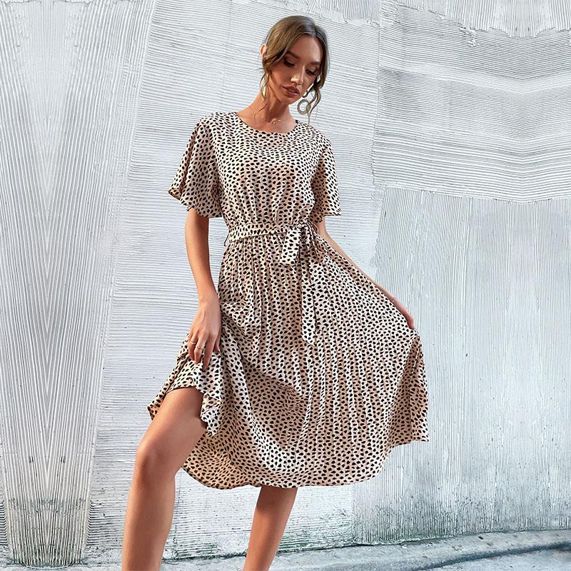 Женская мода лето весна леопардовый принт с коротким рукавом и круглым вырезом с высокой талией повседневные платья