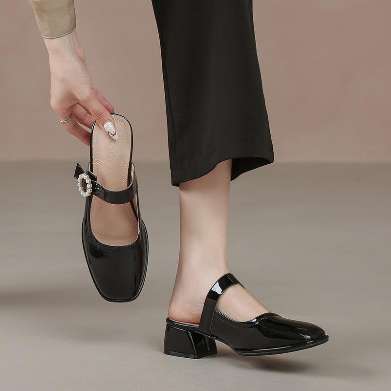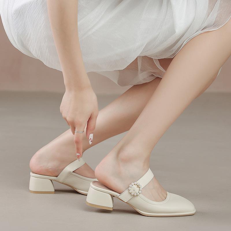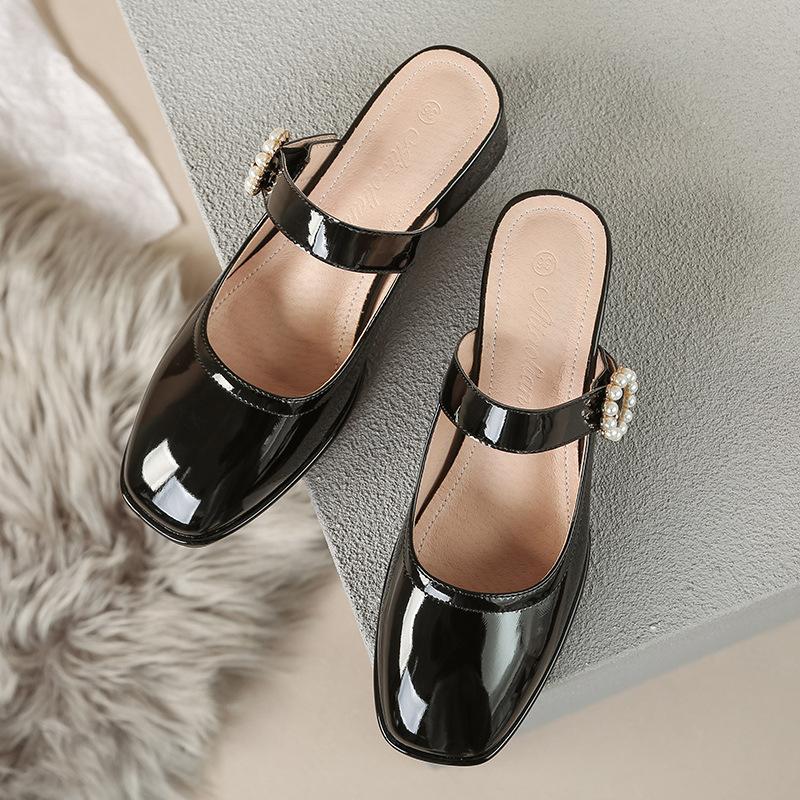 1 piece of casual pearl fashionable and simple square head one-word buckle with shallow mouth flat bottom bag head half drag single shoes women's