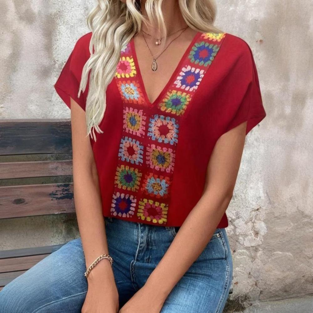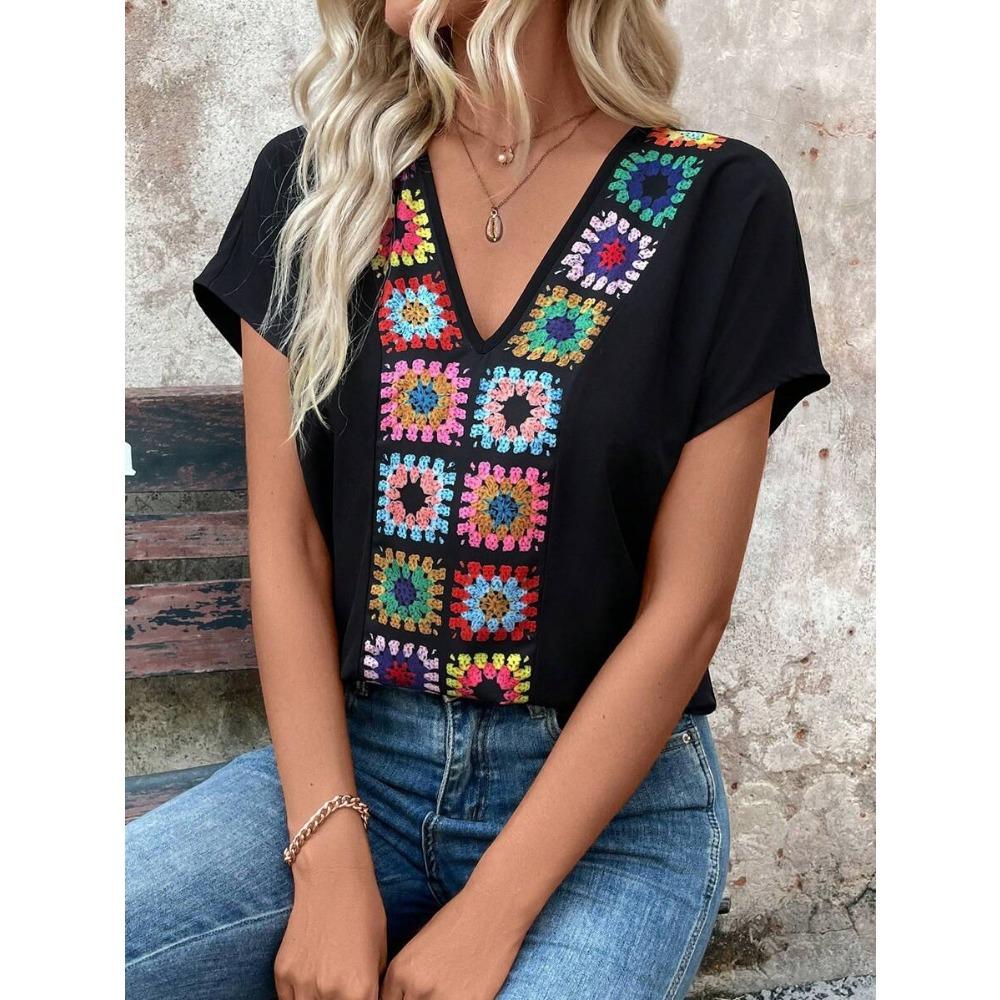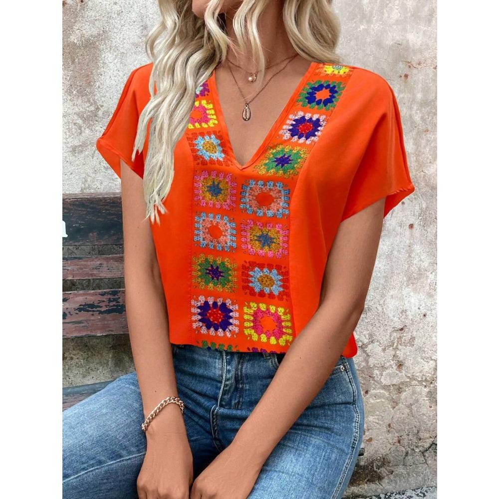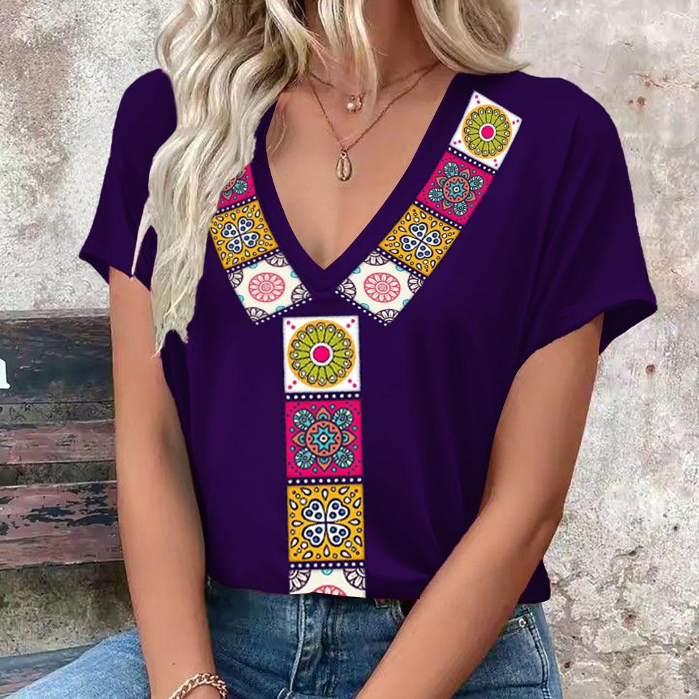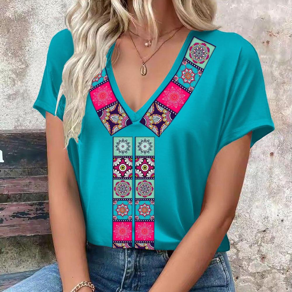 Футболка женская с коротким рукавом и V-образным вырезом, летние повседневные топы свободного покроя, женская одежда большого размера с цветочным принтом, узоры в стиле