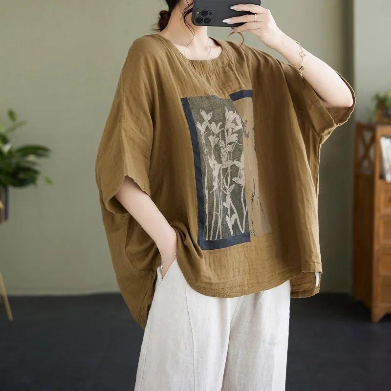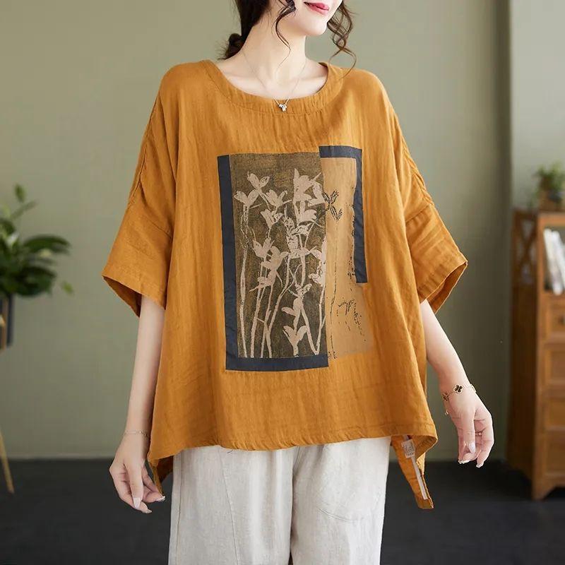 Женская летняя футболка из хлопка и льна с коротким рукавом, большого размера, Харадзюку, с круглым вырезом, свободная, винтажная, с принтом