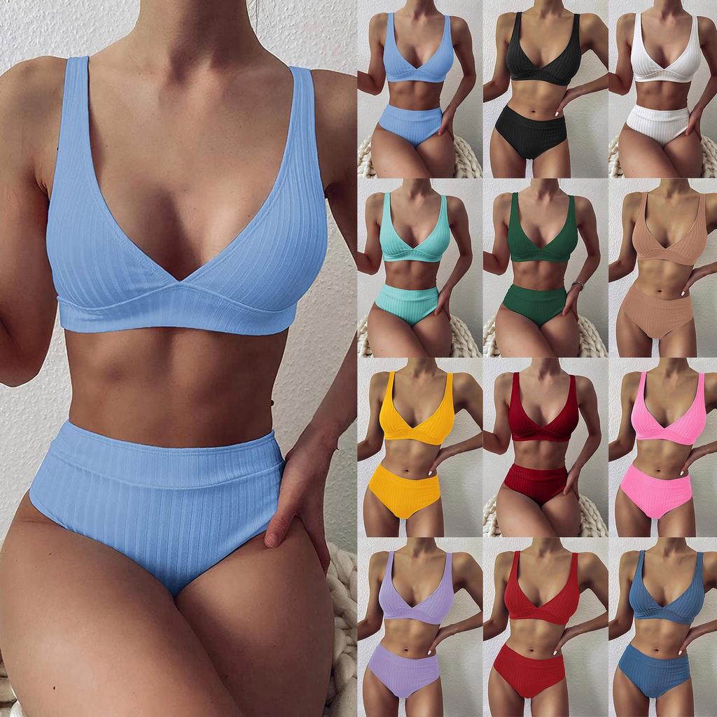 Женский однотонный комплект бикини с высокой грудью и бретельками, купальник из двух частей — купить товар онлайн с бесплатной доставкой до всему миру!