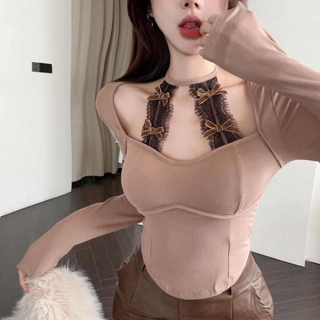 VAYLA Женские футболки с квадратным вырезом, длинным рукавом, облегающие, милая эстетика Y2k, бант, сексуальное кружевное укороченное боди, японский шик, модные облегающие футболки