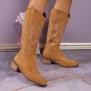 Вышитые ковбойские сапоги для женщин, осенние сапоги с острым носком и толстым каблуком, высокие сапоги до колена, женские свободные длинные сапоги из искусственной кожи