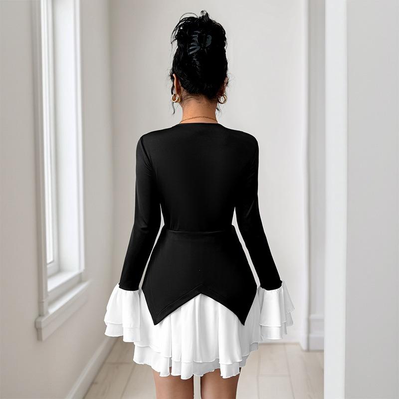YYFS Женская мода весна осень цветные блоки принт длинный рукав V-образный вырез высокая талия повседневные платья
