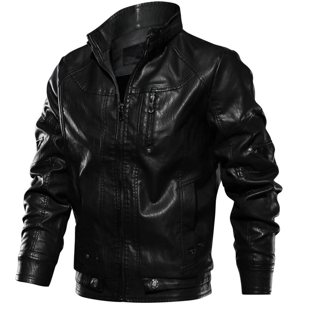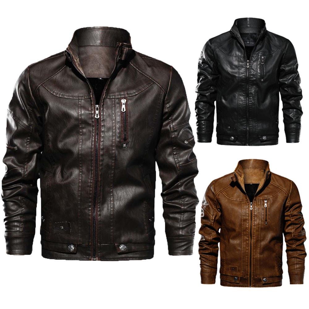 Мужская зимняя повседневная куртка с длинным рукавом, однотонная, стойка, на молнии, кожаная, топ