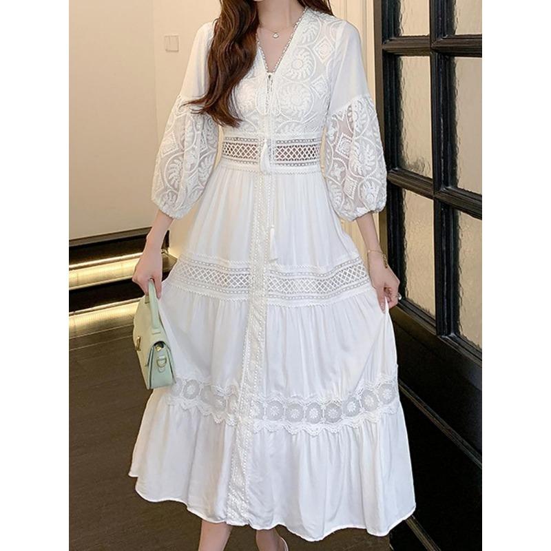 Белое длинное платье, женские летние кружевные платья в стиле бохо, женское пляжное праздничное платье с вырезом