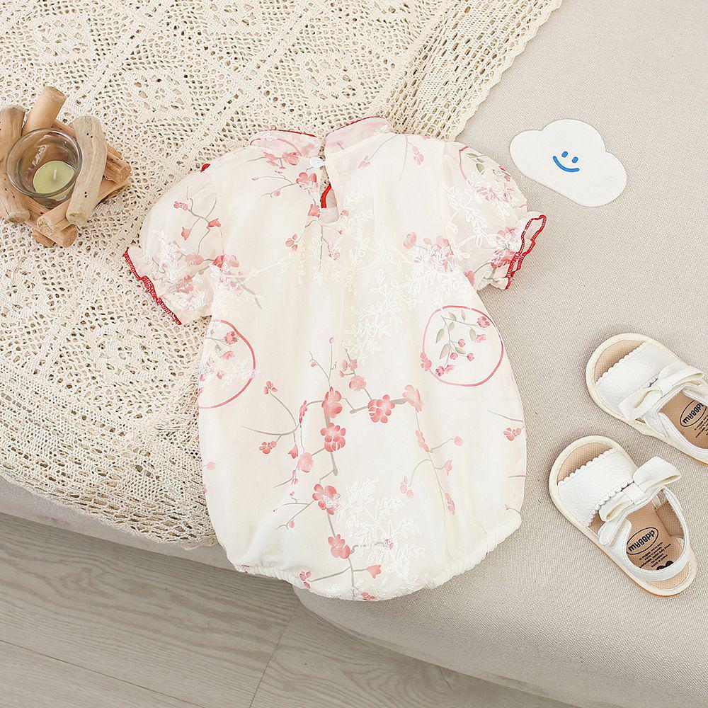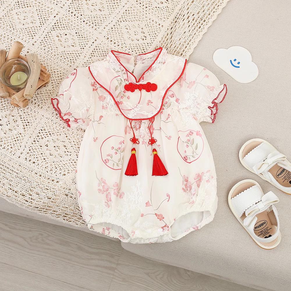 This adorable romper is perfect for keeping your little one stylish and comfortable during the warm summer months. Made from soft, breathable cotton, it ensures your baby's delicate skin is pampered while providing ease of movement. Featuring short sleeves, this romper is designed for optimal comfort and versatility, making it an ideal choice for everyday wear or special outings. With its charming design and premium material, it's a must-have addition to your baby girl's summer wardrobe.