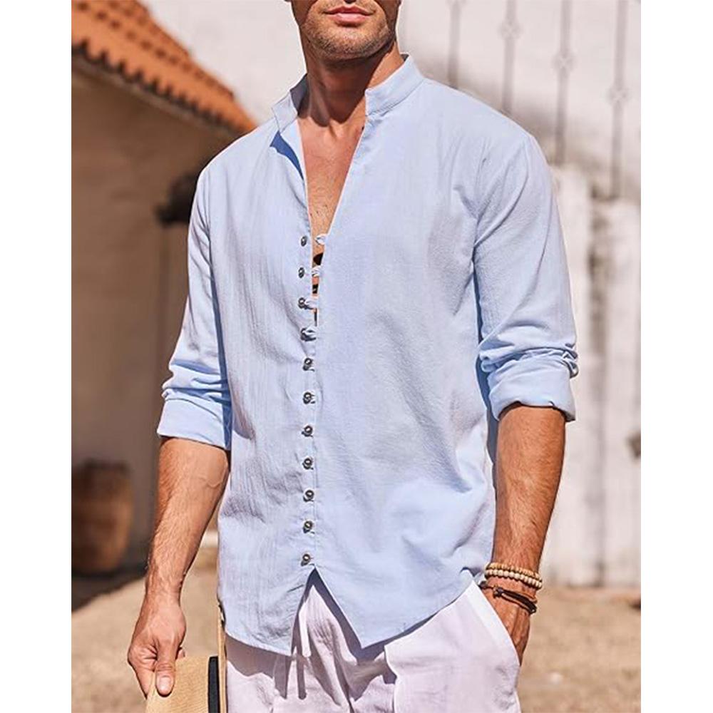 Мужская хлопково-льняная рубашка, мужская пляжная рубашка с длинным рукавом, летняя повседневная однотонная рубашка с воротником Генри