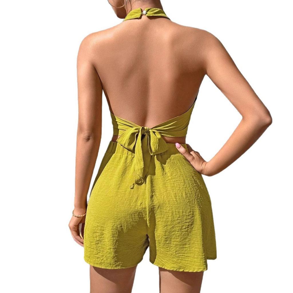 Женский повседневный и модный летний стиль для работы и отдыха, однотонный топ-майка с завязками на шее и шорты