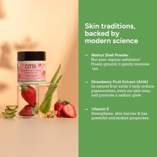 ОТШЕЛУШИВАЕТ И УДАЛЯЕТ ЗАГАР: CITTA Клубничный кремовый скраб для тела обогащен пудрой из скорлупы грецкого ореха и экстрактом клубники, которые мягко отшелушивают и эффективно удаляют загар и омертвевшие клетки кожи для сияющего, ровного цвета лица.