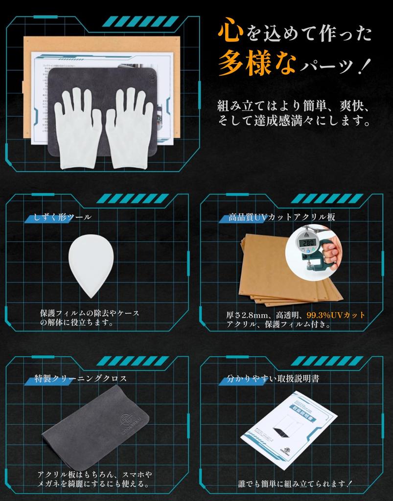[Стабильная, безопасная и прочная конструкция] * Запатентованная конструкция с треугольными соединителями более устойчива, чем защелкивающиеся витрины, и не распадется легко даже при транспортировке или тряске * Обладает большой грузоподъемностью, поэтому сверху можно разместить различные предметы * Акриловая пластина имеет закругленные углы, которые не травмируют руки * В комплект входят оригинальные инструменты для сборки, специальная чистящая ткань и перчатки, что облегчает сборку и разборку.