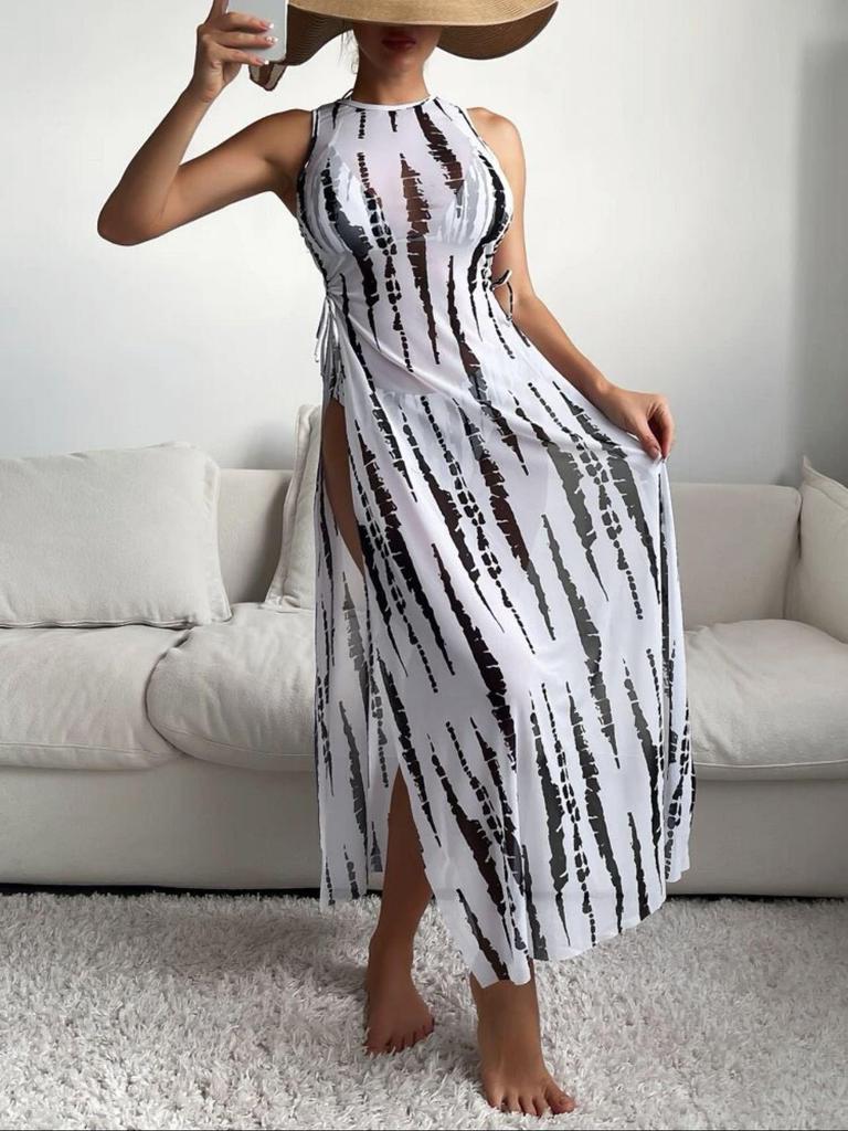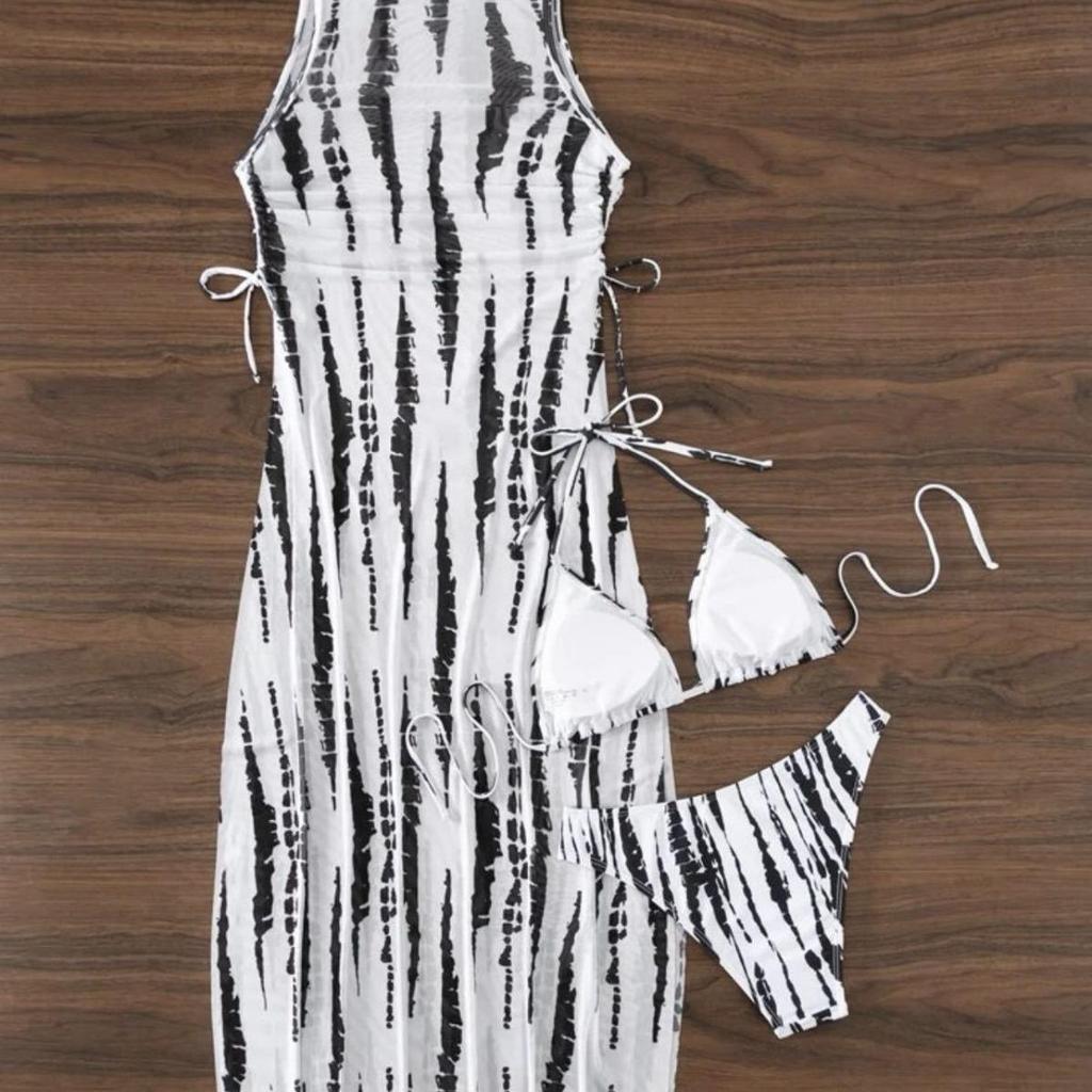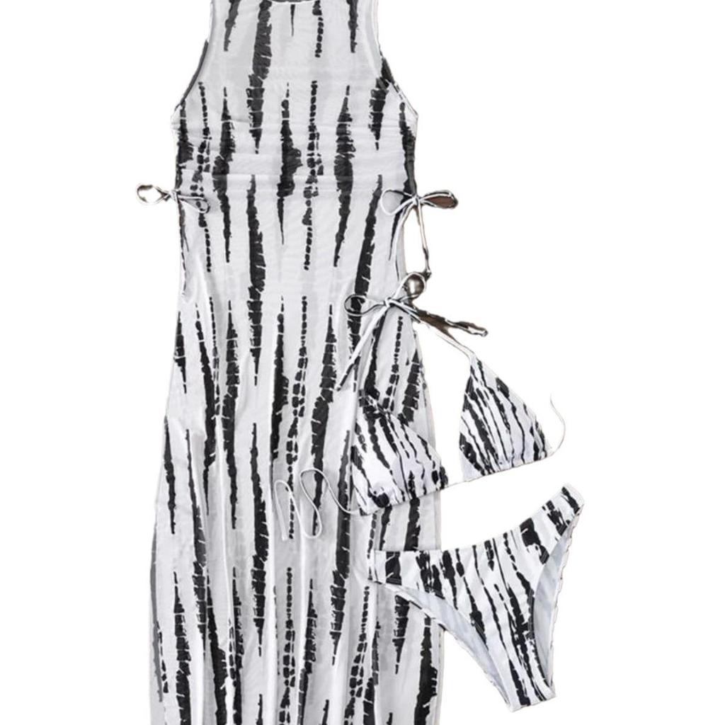Европейский и американский сексуальный комплект-тройка: Длинное сетчатое платье и купальник бикини с принтом