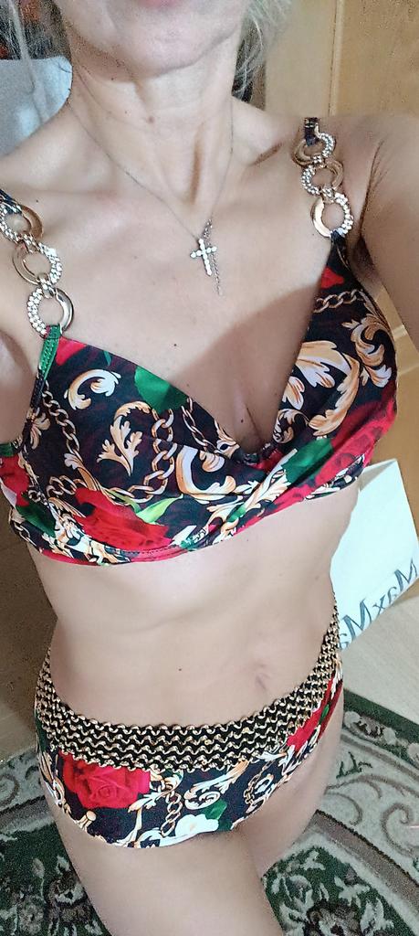 Шикарный купальник,1:1,как на фото!!ношу 44 российский,мой размер бюст 90см твлия74см бедра96см сел идеально!!! Цвет яркий,фурнитура шикарная,цепи тяжелые,блестят, бюстгалтер правда без завязок и без застёжки,но лиф держит крепко ..берите,не пожалеете