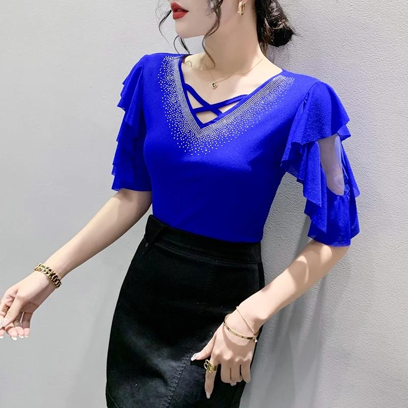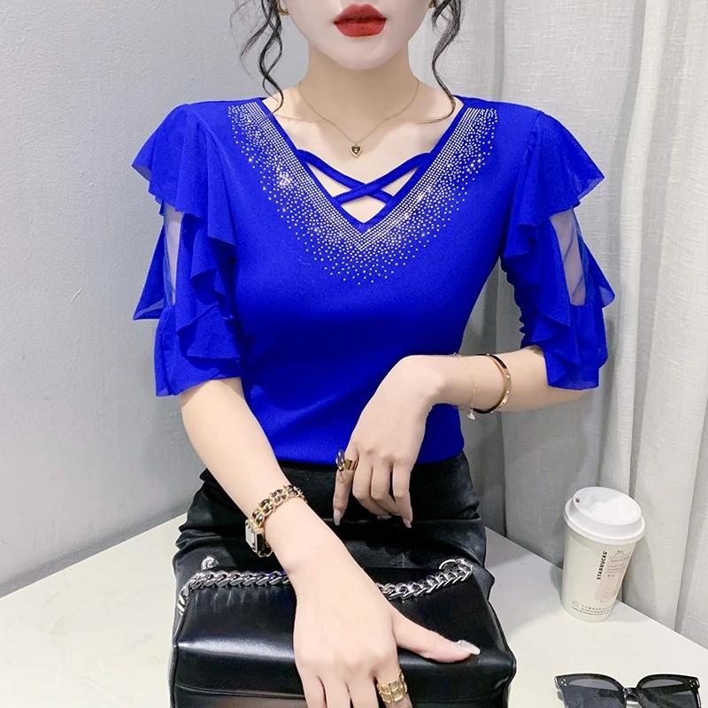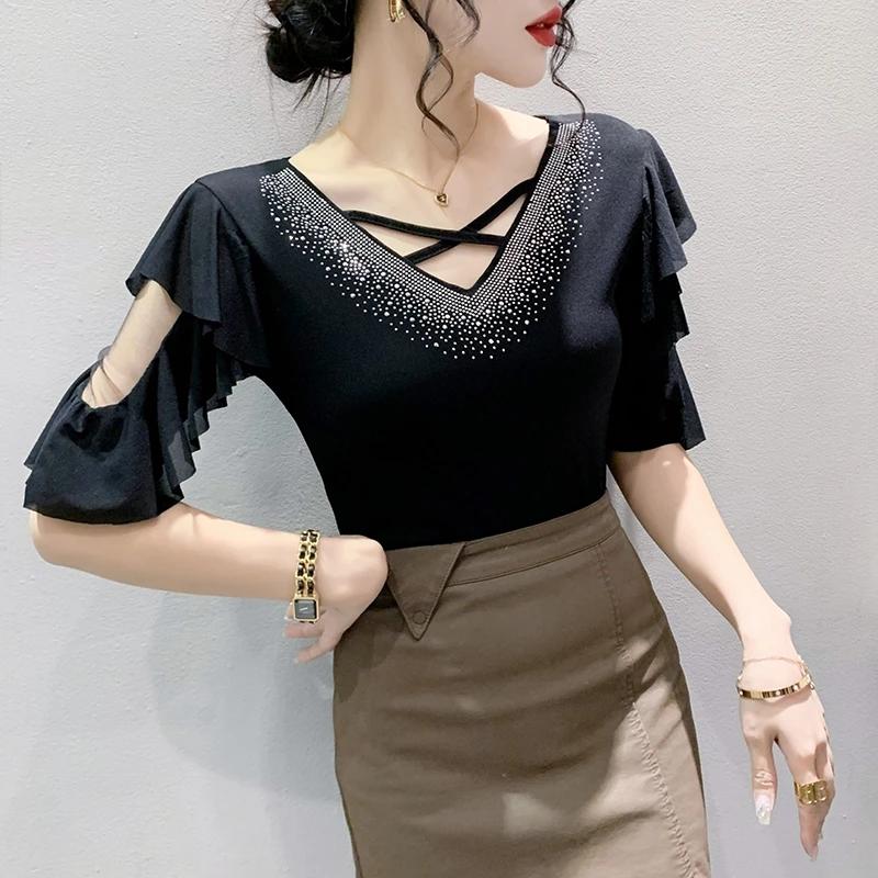 Новая летняя европейская одежда женская футболка модная сексуальная с V-образным вырезом топы с блестящими бриллиантами шикарная с ажурной отделкой короткий рукав все сочетается футболки