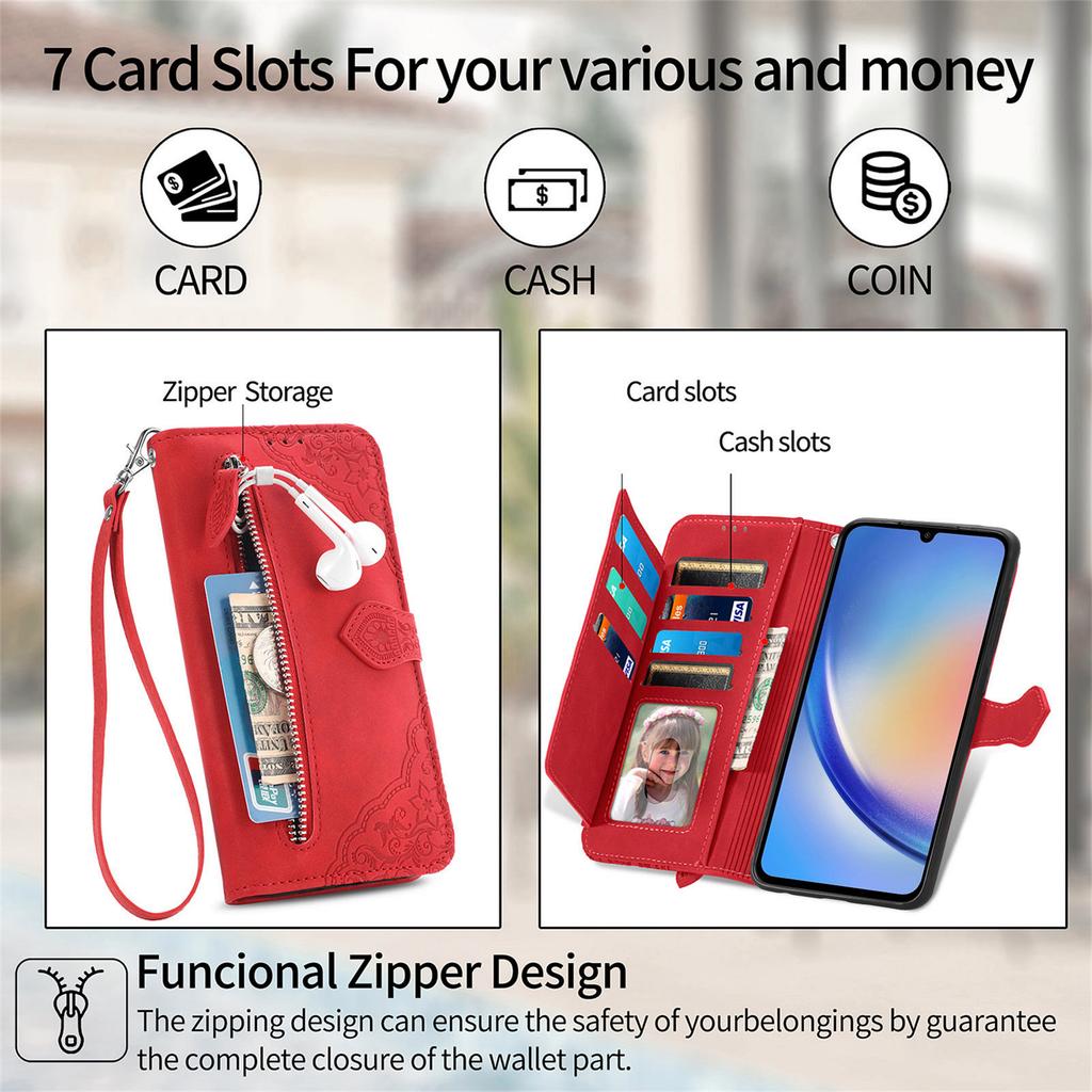 Чехол-кошелек на молнии для Samsung Galaxy A15 4G/A15 5G с ремешком, с цветочным тиснением, из ПУ кожи, чехол для телефона