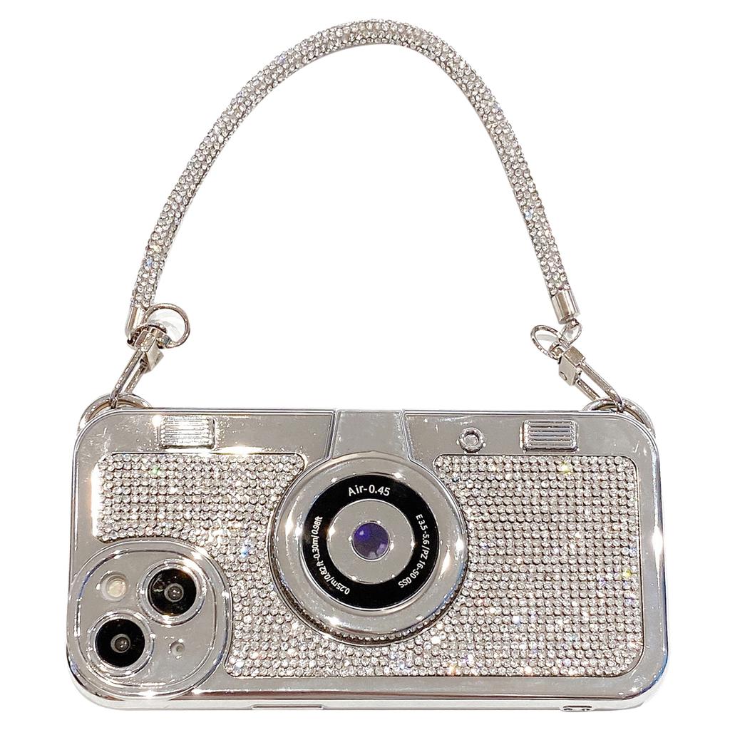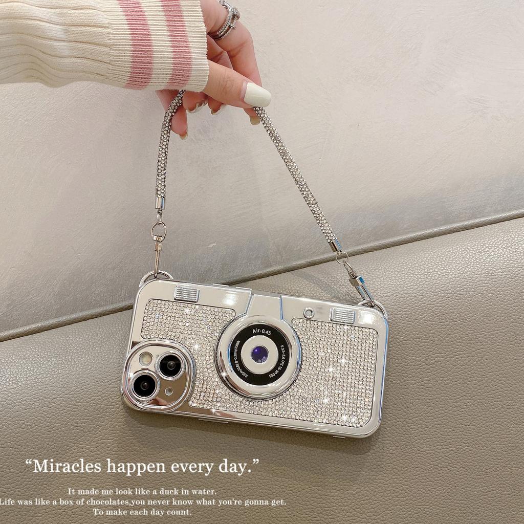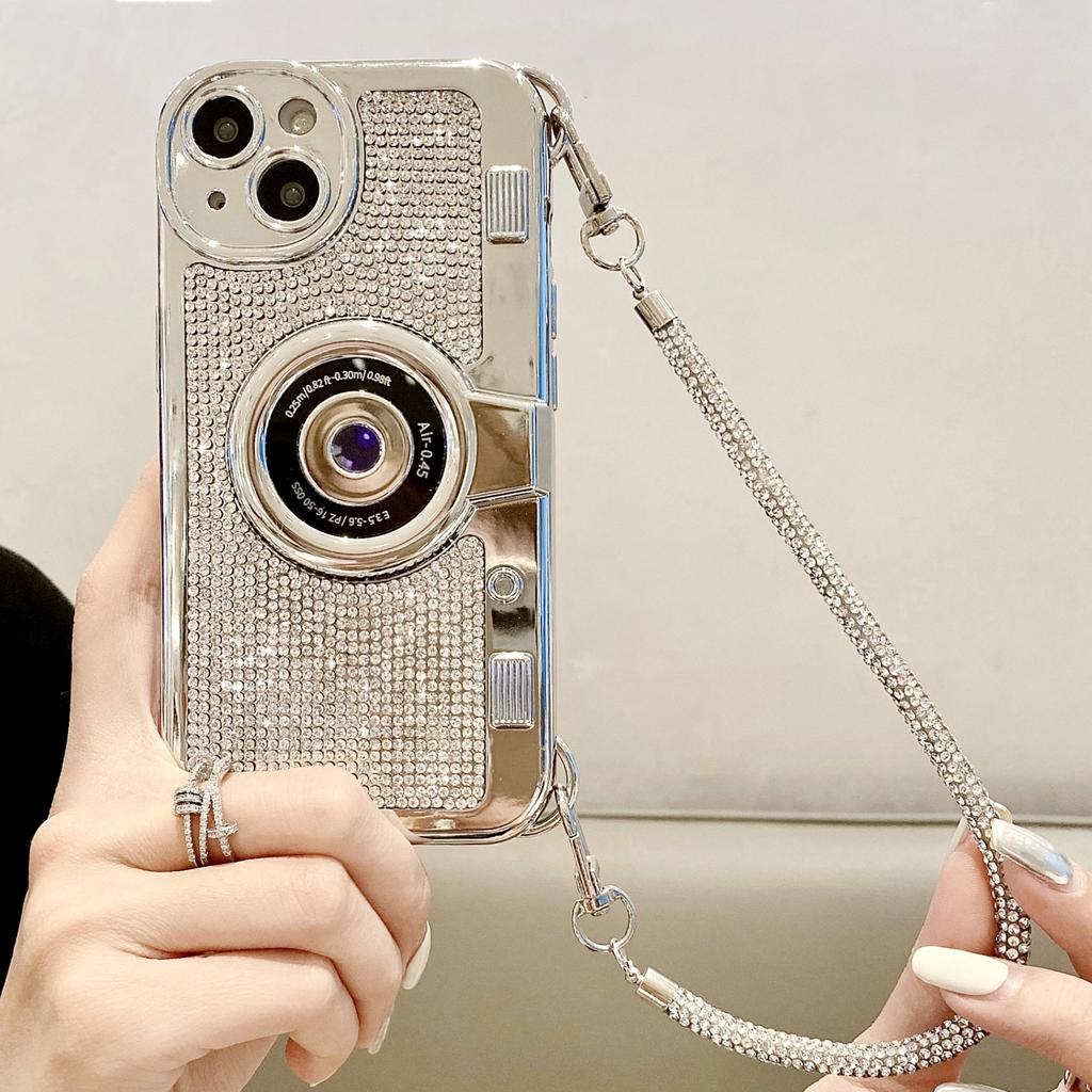 Для iPhone 14 Plus сотовый телефон запчасти оптом горный хрусталь чехол в форме камеры TPU чехол с цепочкой для переноски