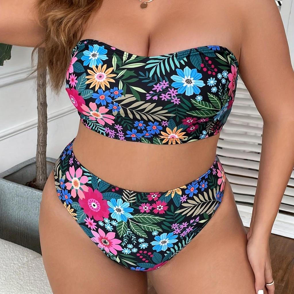 Купальник-бандо с высокой талией большого размера 2024 - Европейский и американский принт