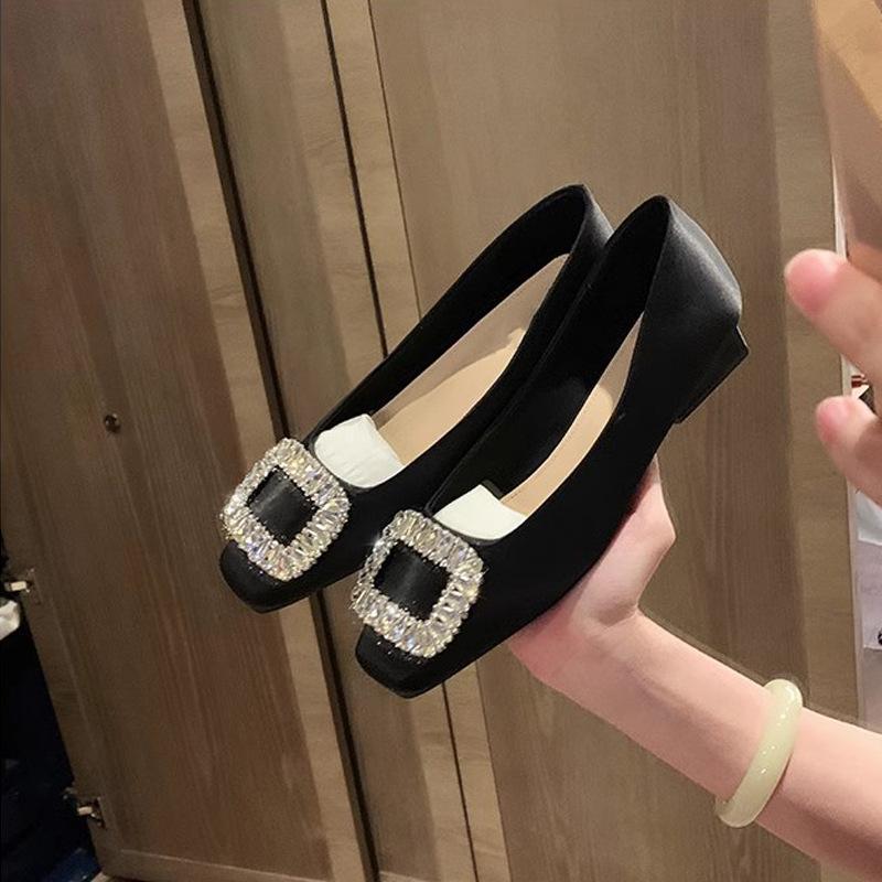 Весенние новые туфли-лодочки с квадратным носком, стразами, серебристые, на плоской подошве, из мягкой кожи, с темпераментным офисным стилем
