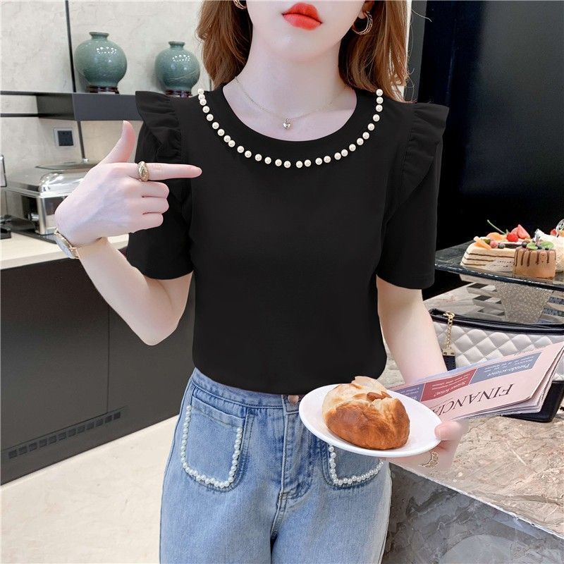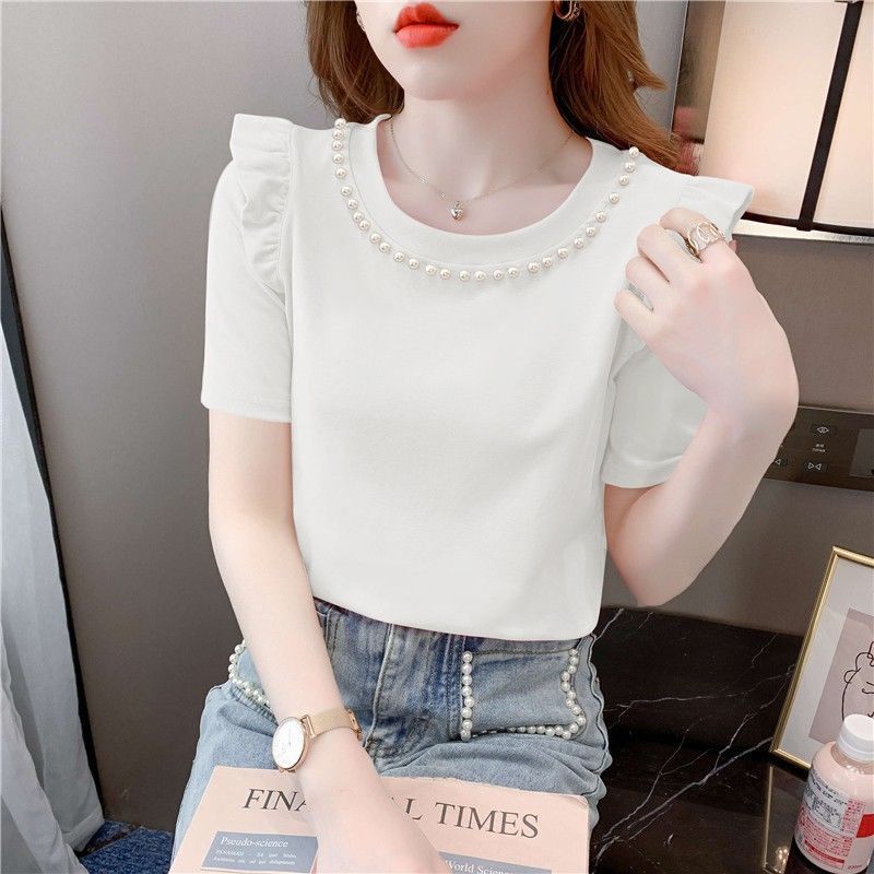 Милая футболка с коротким рукавом и изображением листа лотоса для летней моды, украшенная бусинами-гвоздиками, с круглым вырезом, облегающая, универсальный топ, рубашка в западном стиле