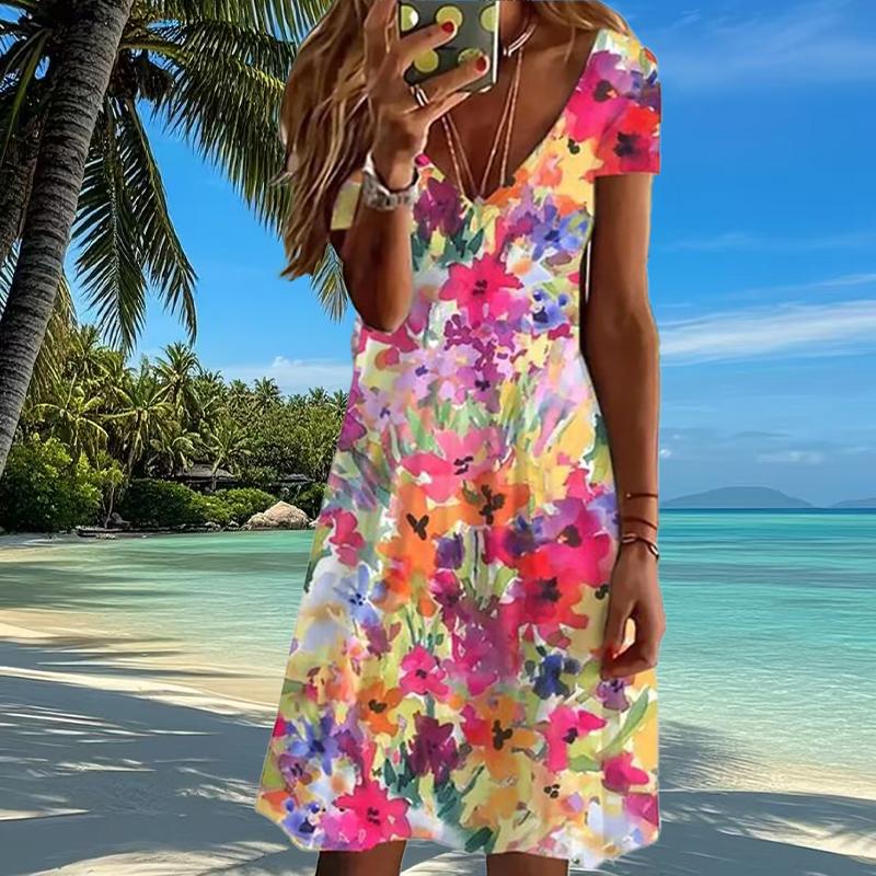 Летняя мода женские V-образный вырез короткий рукав цветочный принт платье сексуальные короткие юбки платья