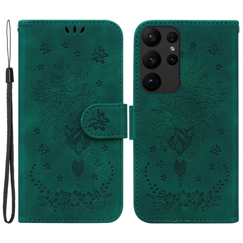 For Samsung Galaxy S23 Ultra PU Leather Book Stand Wallet Case Imprinted Rose Butterfly Magnetic Closure Flip Phone Cover with Strap