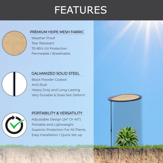 Защитите свои растения с легкостью с помощью наших зонтов для растений. Этот инновационный солнцезащитный козырек оснащен системой из 3 оцинкованных стальных стержней, регулируемой по высоте до 24 или 40 дюймов, что делает его универсальным для растений различных размеров и типов.. Вилочные сваи обеспечивают надежную установку в любом типе почвы, обеспечивая устойчивость даже в ветреную погоду.