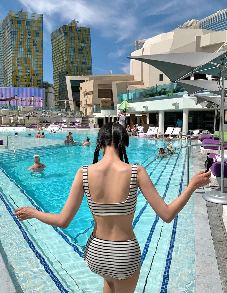 2023 Черно-белый полосатый купальник бикини из двух частей с высокой талией и открытой спиной в корейском стиле для женщин