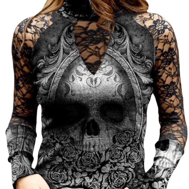 Женская кружевная футболка с высоким воротом и черепом и цветочным принтом, готические модные топы с длинными рукавами и полыми рукавами