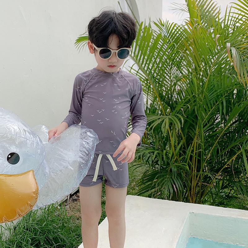Придайте изысканности пляжной одежде вашего ребенка с этим быстросохнущим купальником в корейском стиле.. Изготовленный из высококачественного нейлона, он обеспечивает комфорт и долговечность для активных дней на пляже или у бассейна.. Стильный серый принт с чайками добавляет модный штрих, который понравится маленьким мальчикам.. Этот купальник, созданный как для стиля, так и для функциональности, обещает идеальную посадку для бесконечных водных приключений.