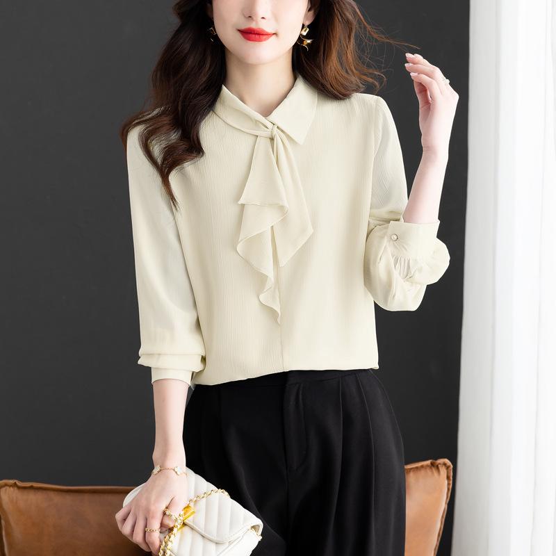 Весна 2025 Блузка из французского шифона с лентами - Омолаживающий топ с длинным рукавом для женщин