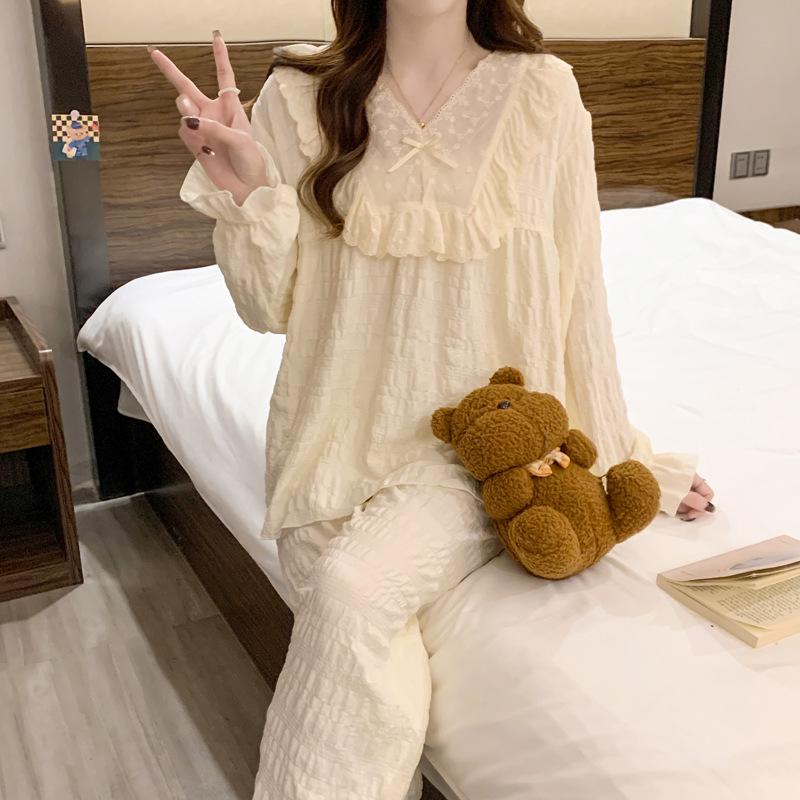 Пижама женская из креп-жатки с кружевом в японском стиле - Весенняя с длинным рукавом однотонная — купить товар онлайн с бесплатной доставкой по всему миру!
