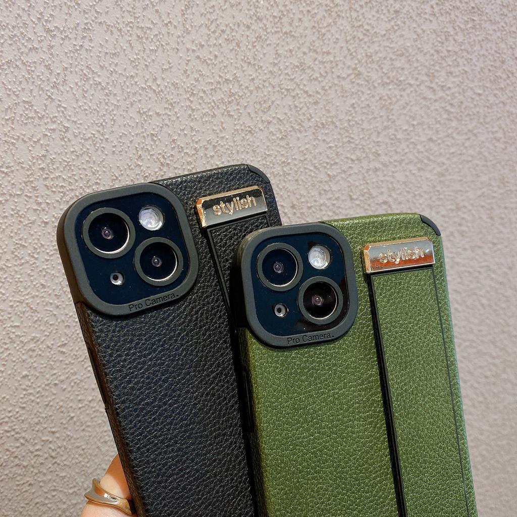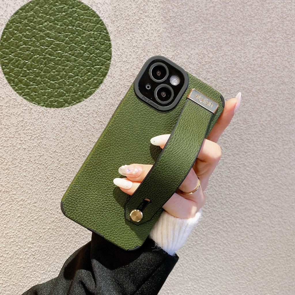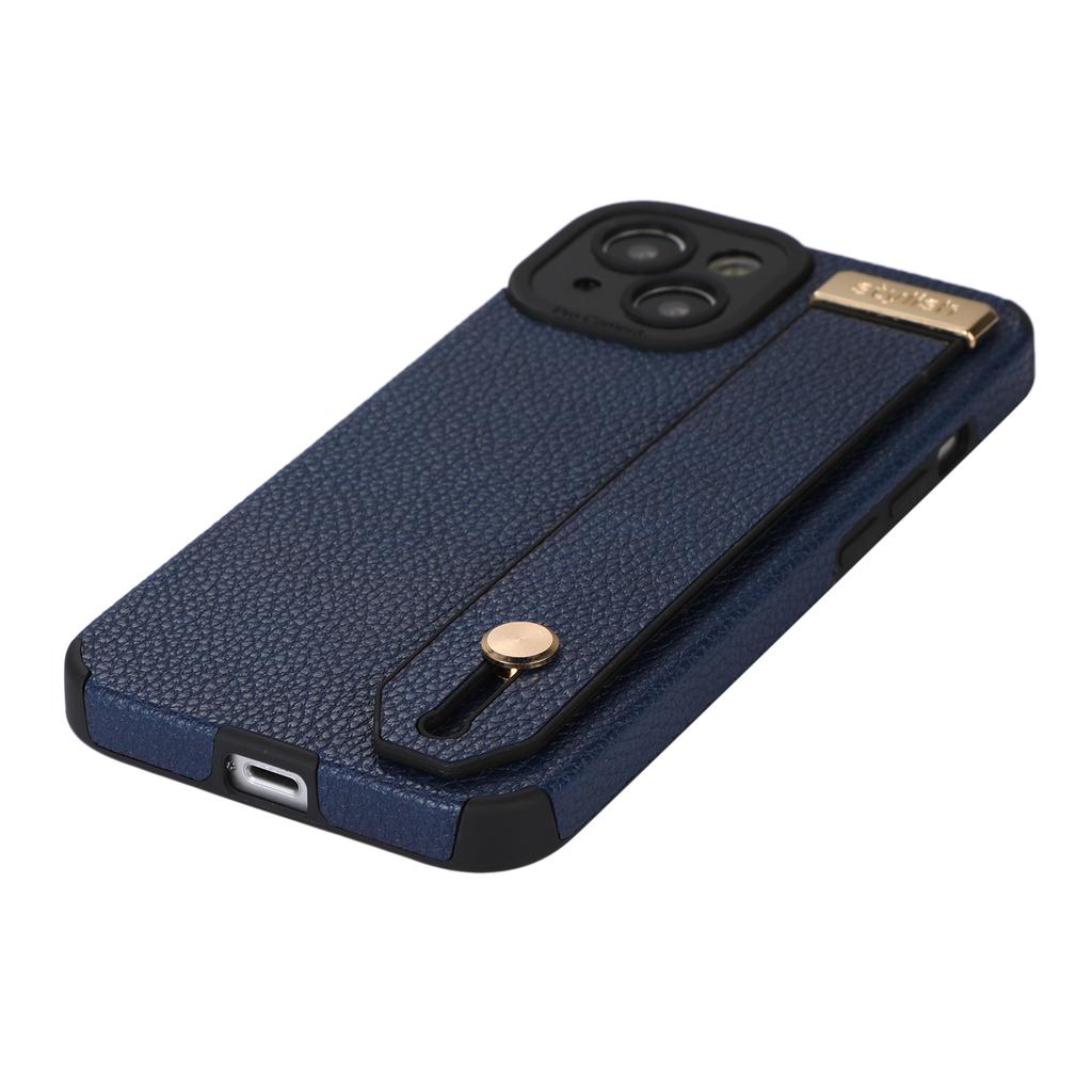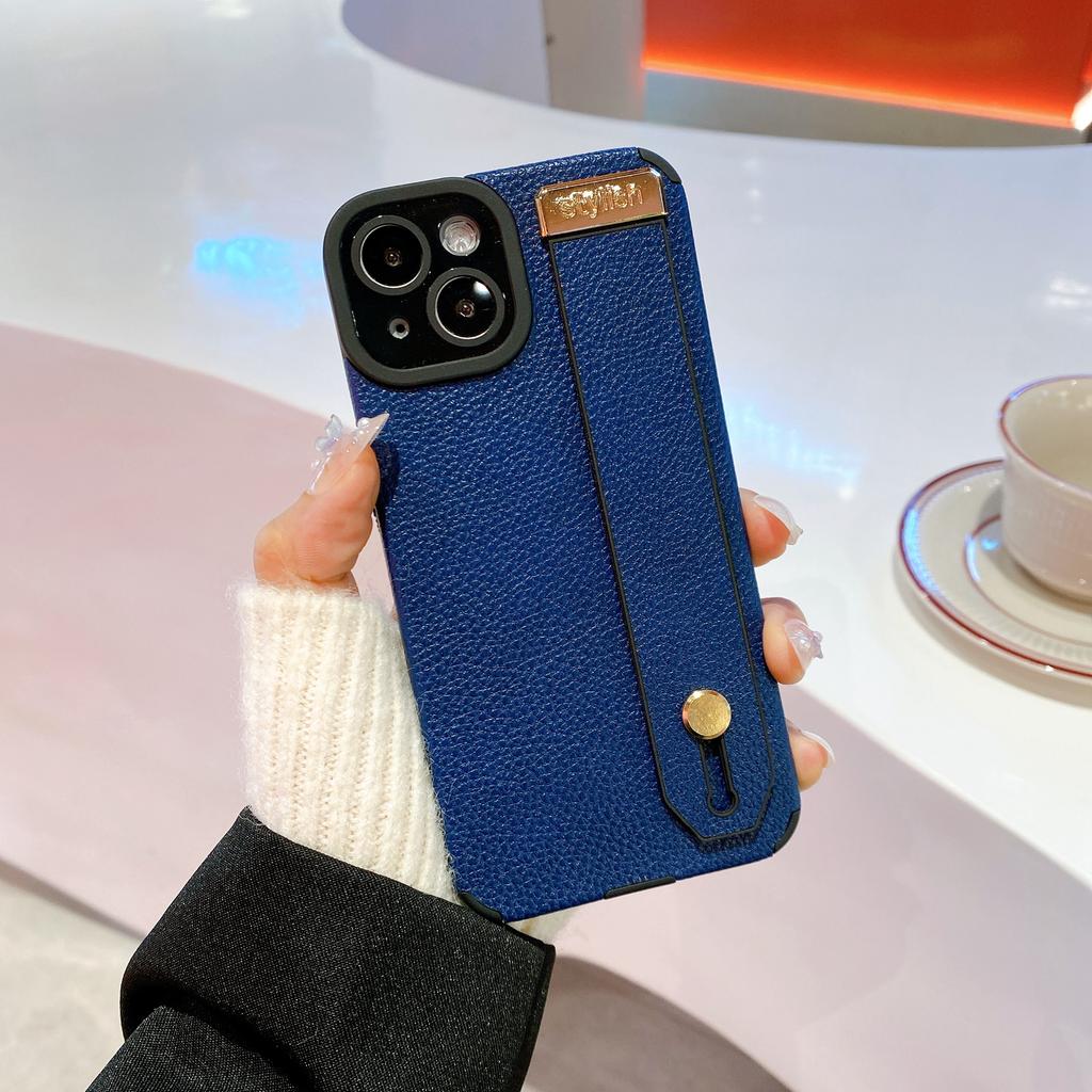 For iPhone 13 Case Kickstand Wrist Strap Textured PU Leather+TPU Phone Cover