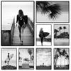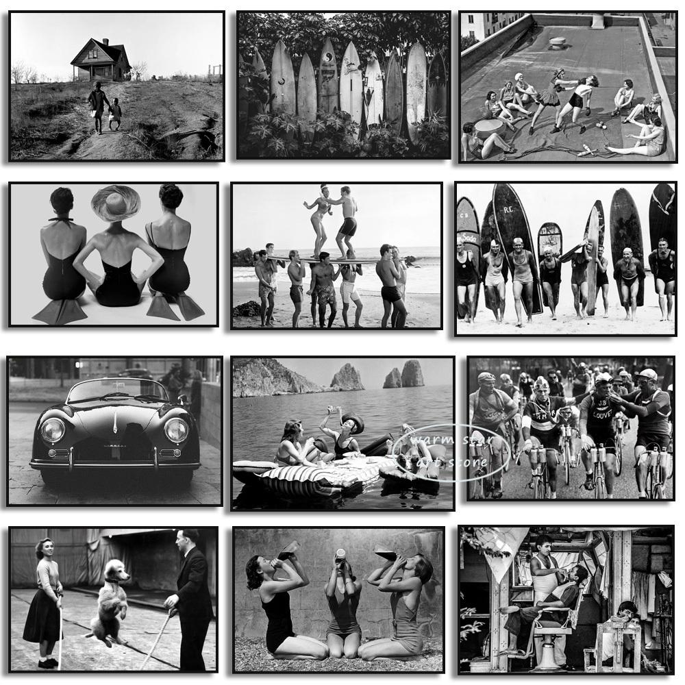 Винтажная черно-белая фотография велоспорта, серфинга, пляжа, гольфа, стрижки, постер, принт, женщины едят пасту, холст, картина, домашний декор