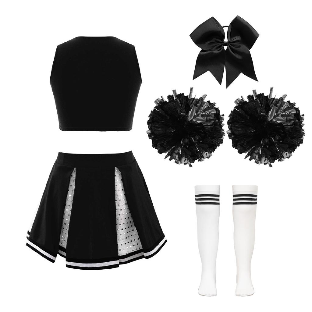 Детский комплект для девочек, комплект для черлидинга, блестки, перекрещивающиеся полоски спереди, V-образный вырез, без рукавов, укороченный топ, плиссированная юбка, 1 головной убор с бантом, 2 шт., цветы в виде руки