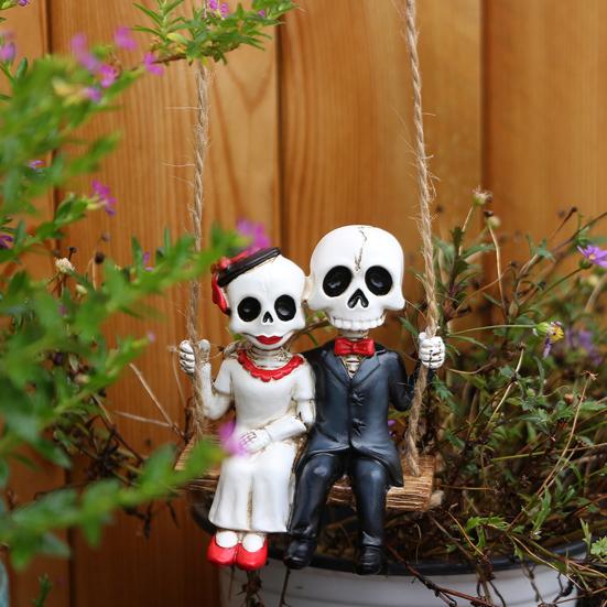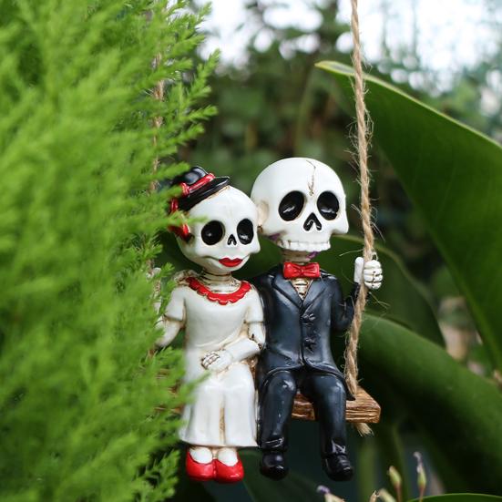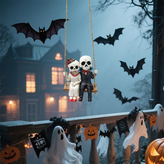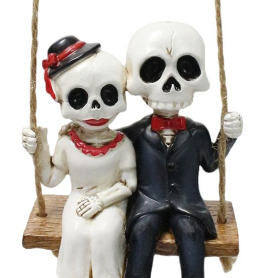 Украсьте свой Хэллоуин этим скелетом. Изготовленный из высококачественной смолы, этот подвесной дизайн идеально подходит для дверей, окон, веток или стен.. Замысловатые детали и прочная конструкция обеспечивают долговечность.. Готический романтический дизайн изображает пару скелетов, качающихся вместе, добавляя вашему пространству нотку странного, но милого очарования..