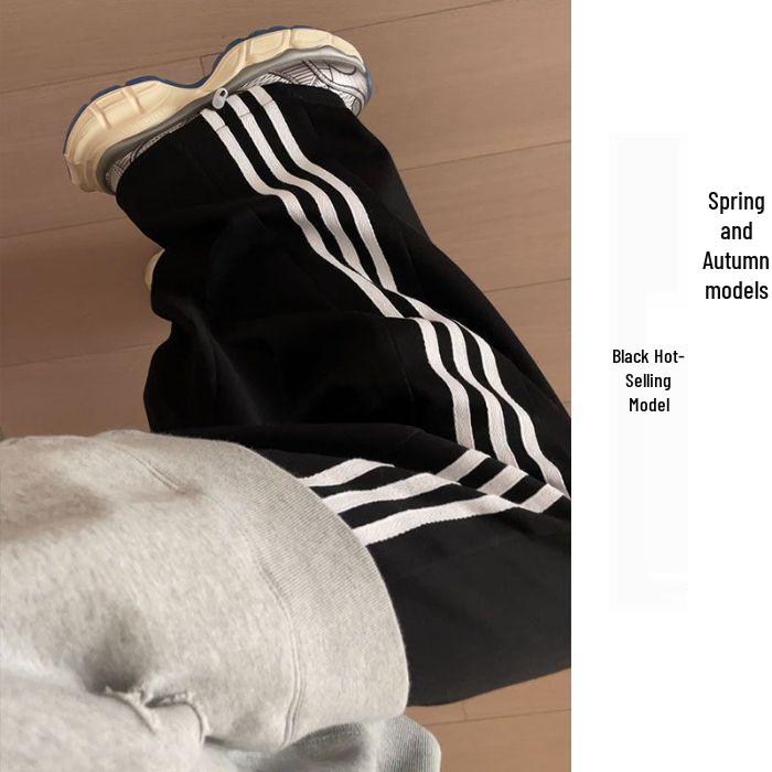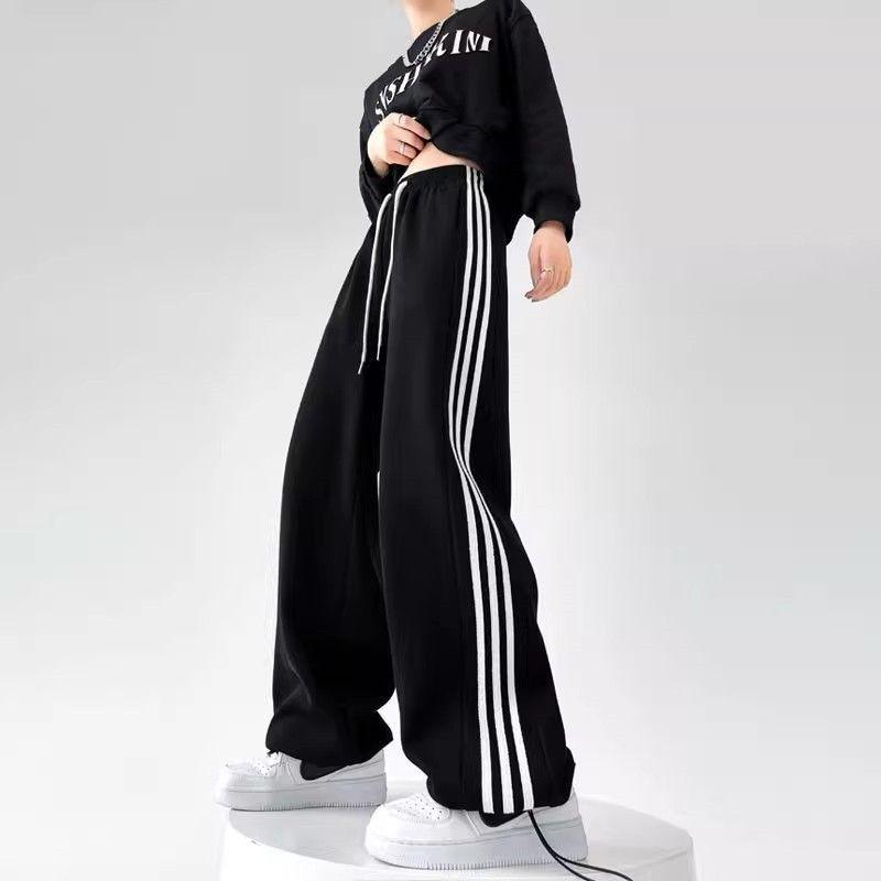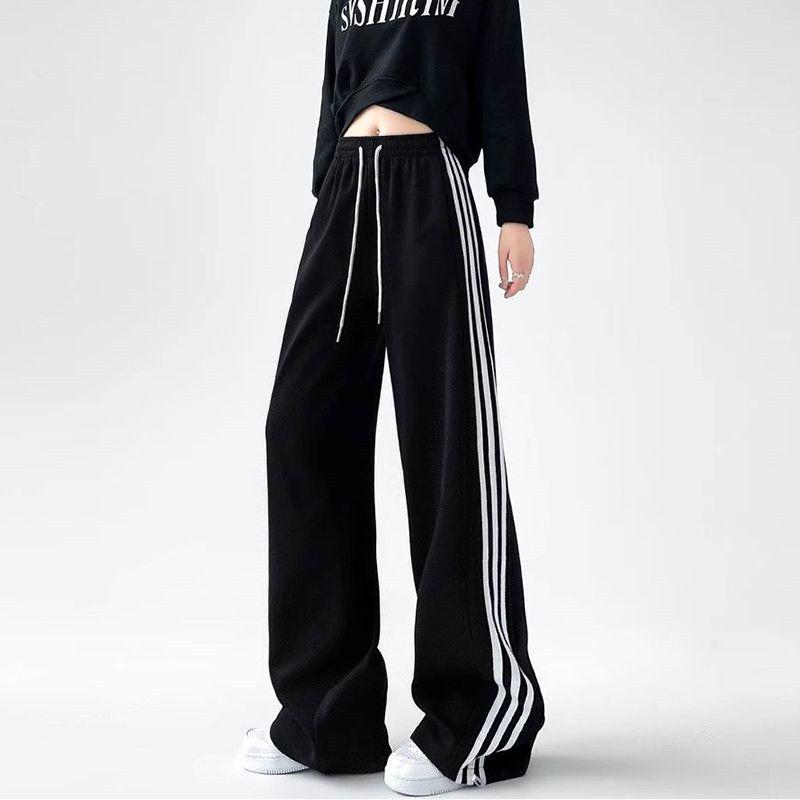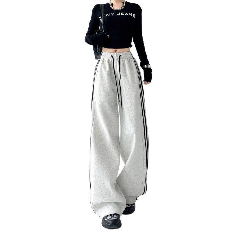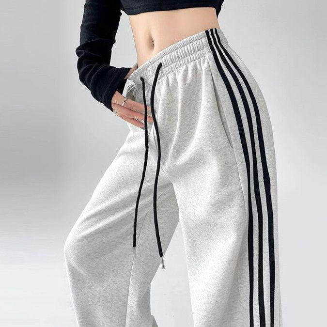 Серые женские спортивные брюки с высокой посадкой и широкими штанинами с тремя полосками - Коллекция Весна 2025, Стройнящие, Универсальные, Повседневные на кулиске.