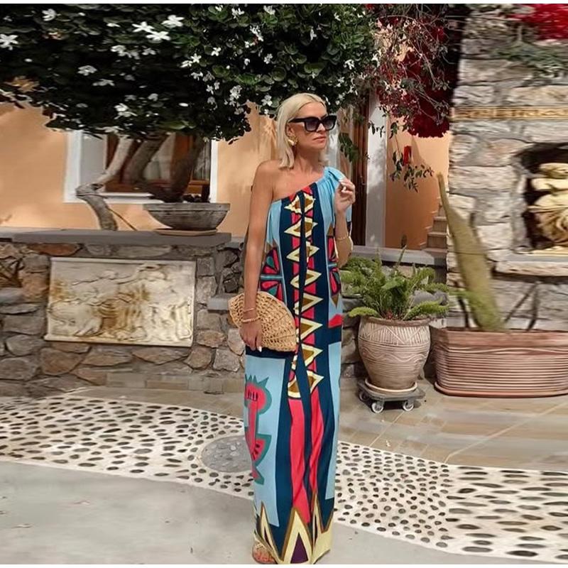 2025 Позиционирующая печать Диагональное плечо Отпуск Длинная юбка Женское платье Отпуск Ветер Пляжный Повседневный Модный Длинное платье
