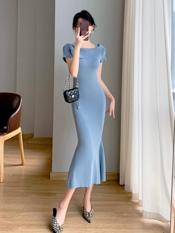 Весенне-летнее вязаное платье из ледяного шелка с коротким рукавом и юбкой «рыбий хвост»