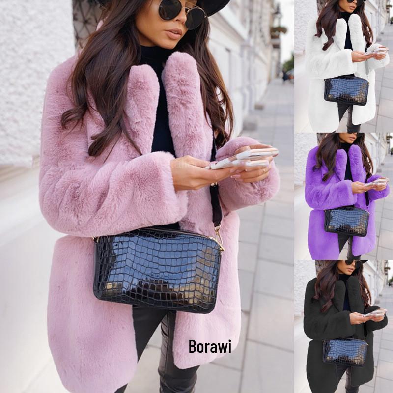 Женское однотонное пальто из искусственного меха с лацканами и длинными рукавами - европейский и американский стиль, теплое, большого размера