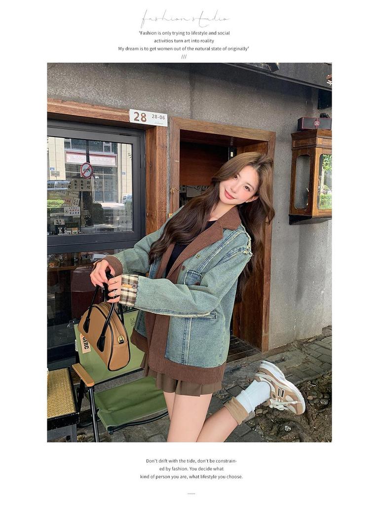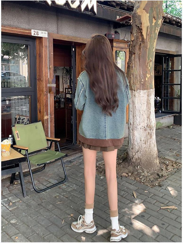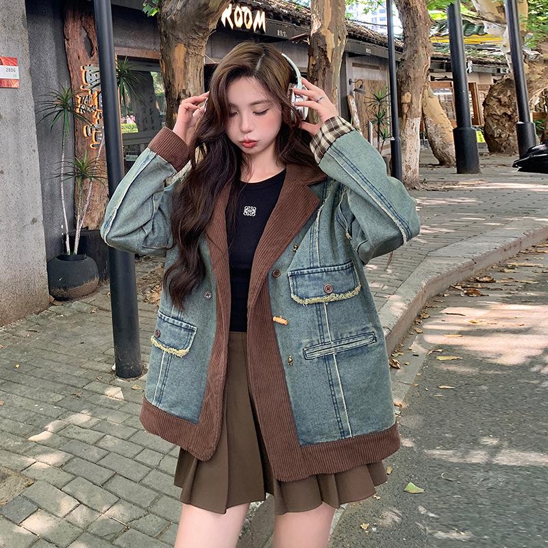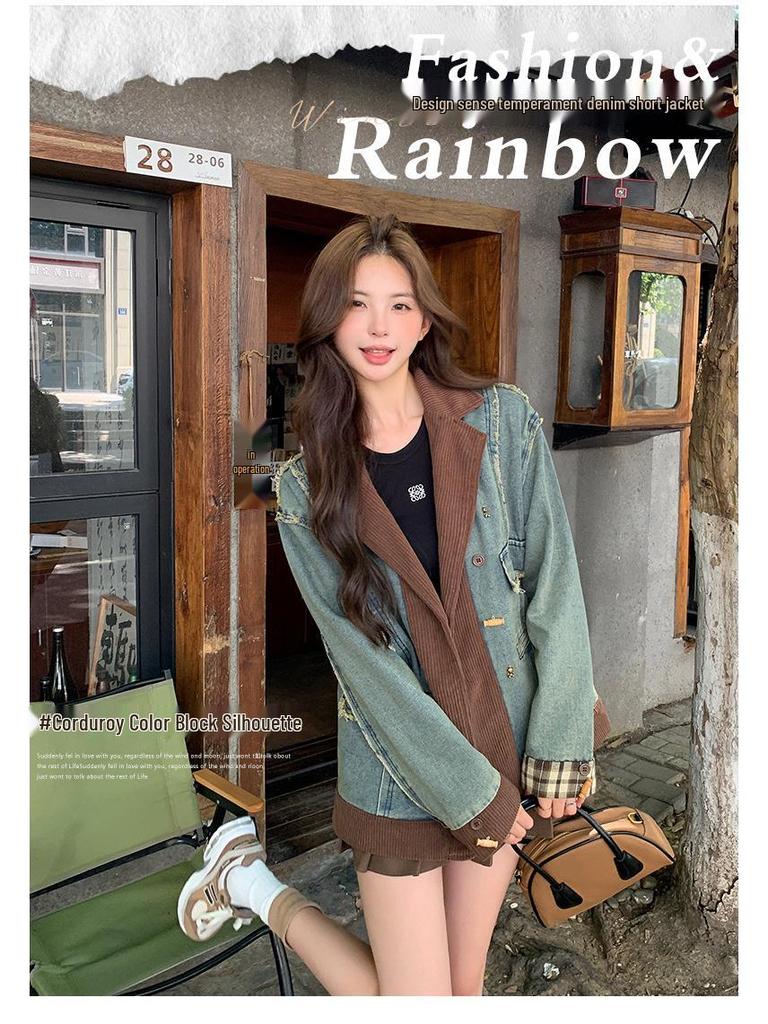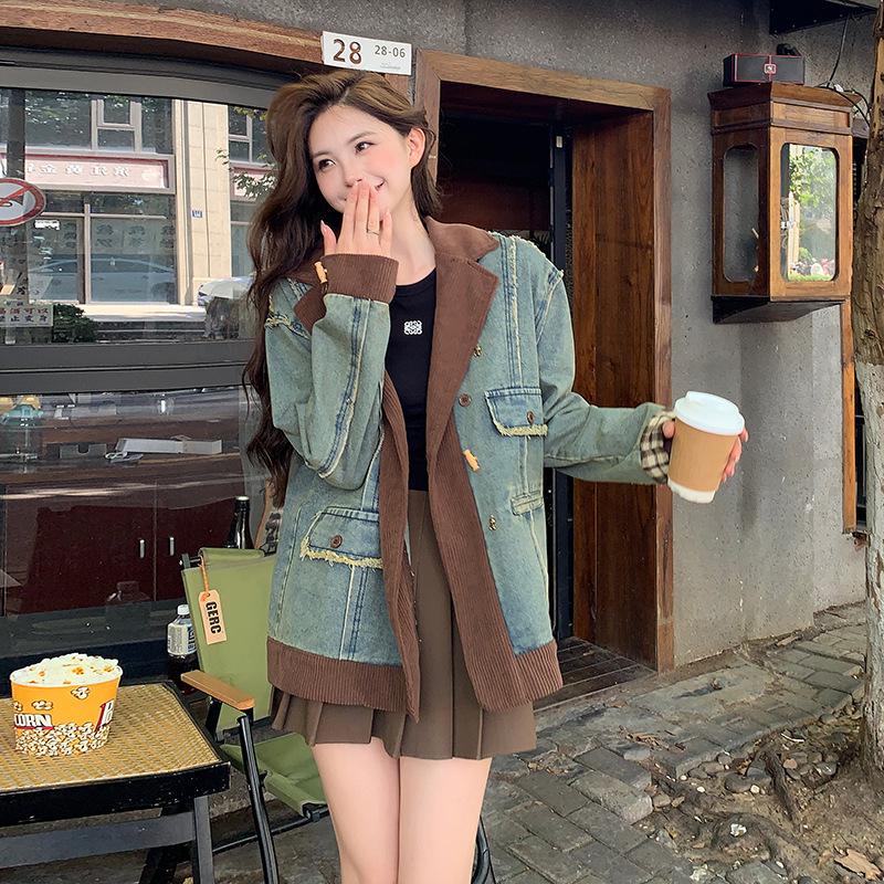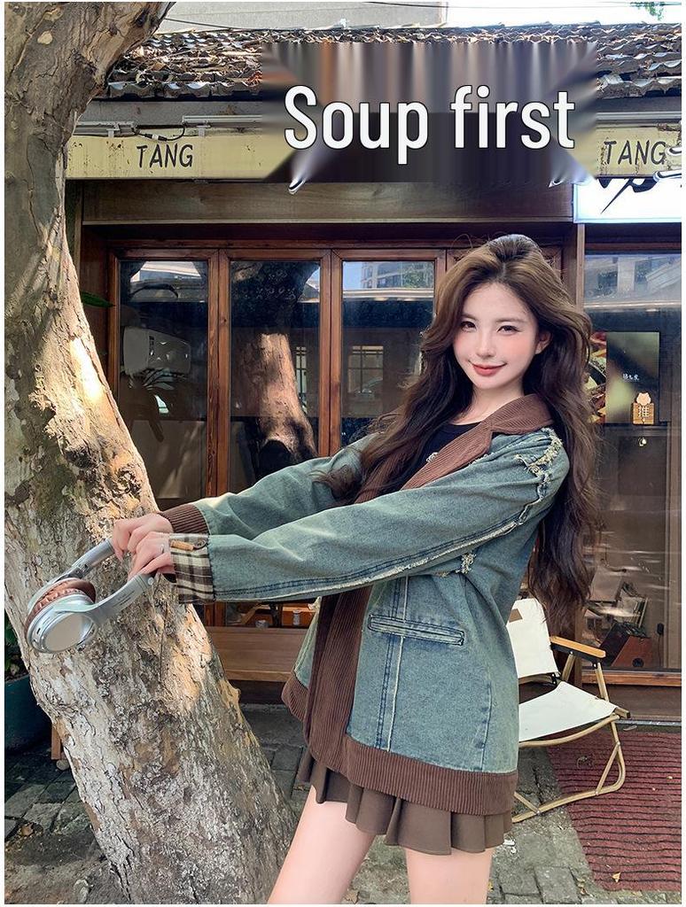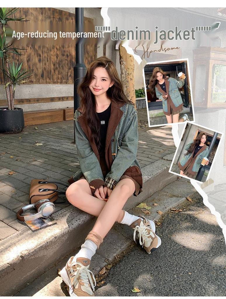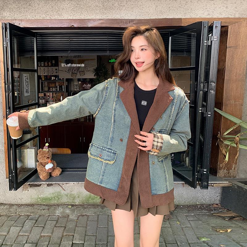 2024 Женская Модная Осенняя Джинсовая Куртка с Лоскутным Дизайном и Воротником-Стойкой