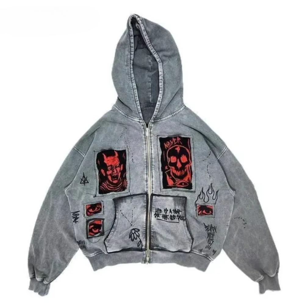 Американская печатная имитация стирки Имитация джинсовой ткани Толстовка с капюшоном на молнии Куртка Кардиган Такой же стиль Свободный Большой размер