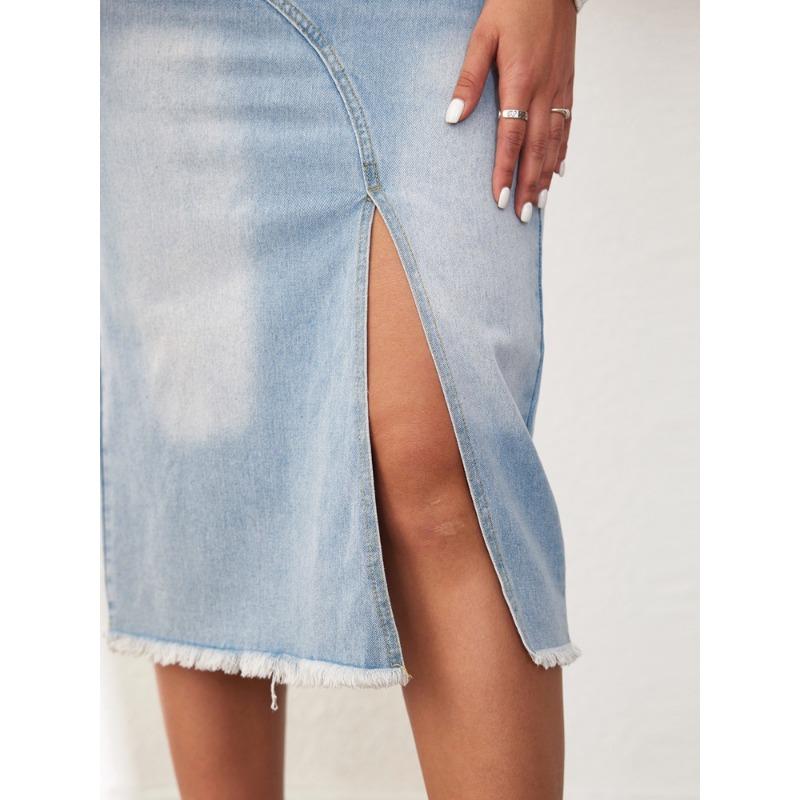 Летняя женская юбка средней длины с необработанными краями, джинсовая юбка с высокой талией и разрезом спереди, полуюбка трапециевидной формы