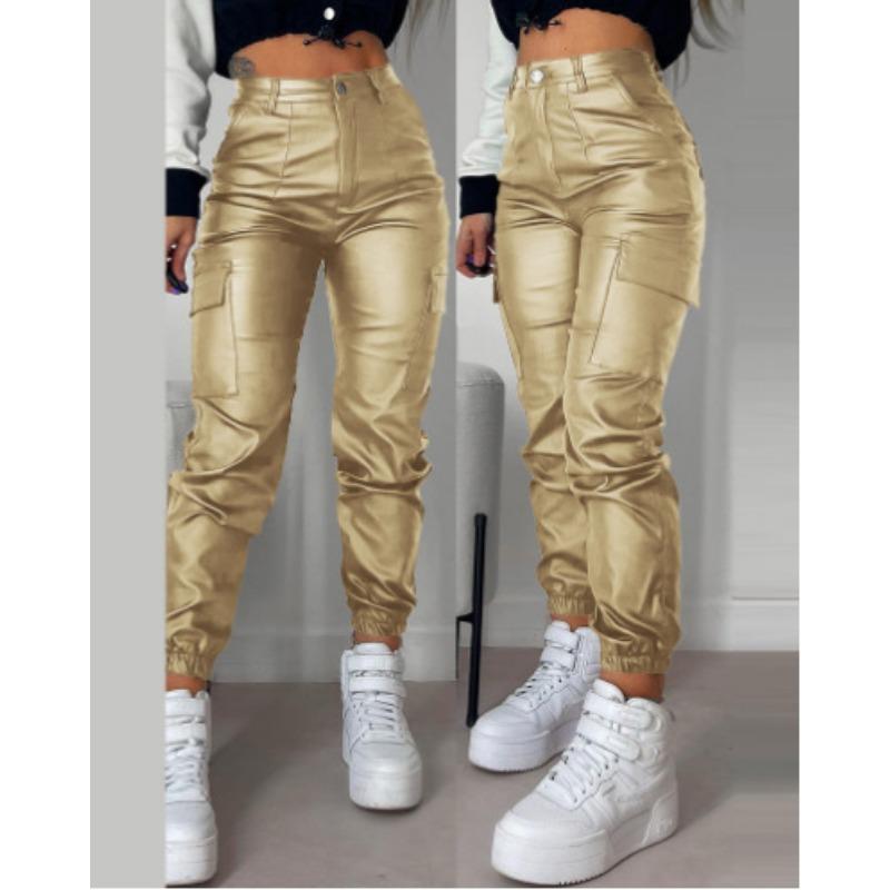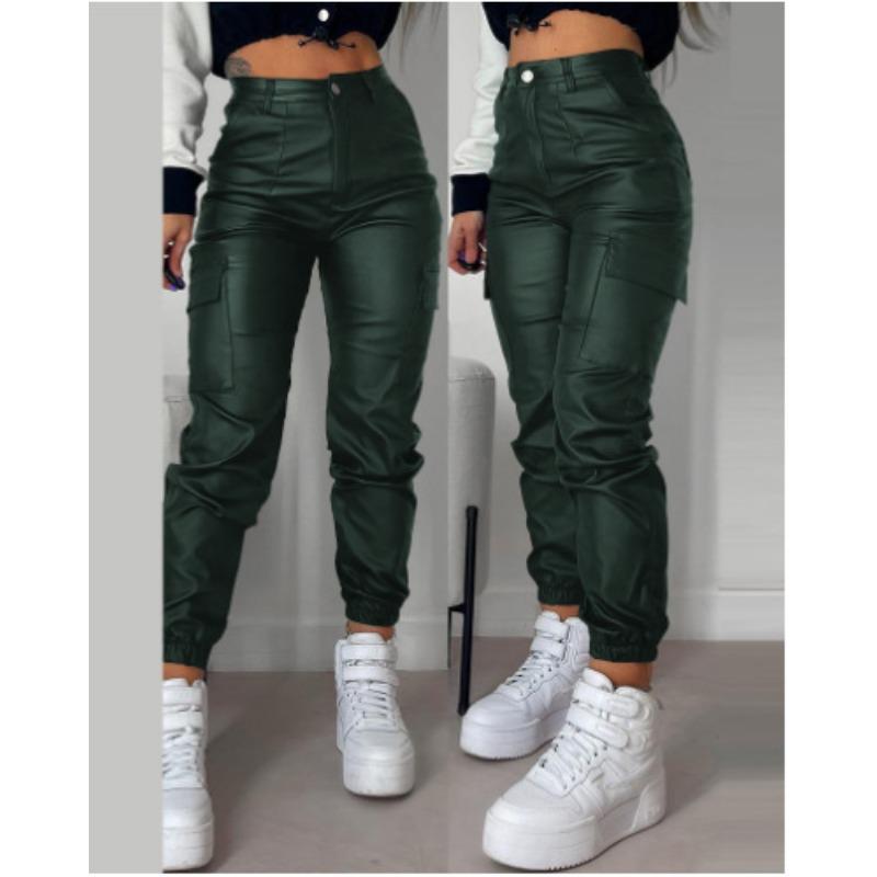 Осенние и летние женские брюки в байкерском стиле со плиссированными карманами на молнии, модные повседневные узкие брюки из искусственной кожи с накладными карманами