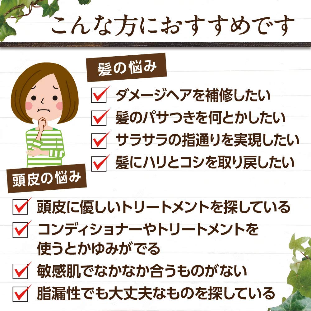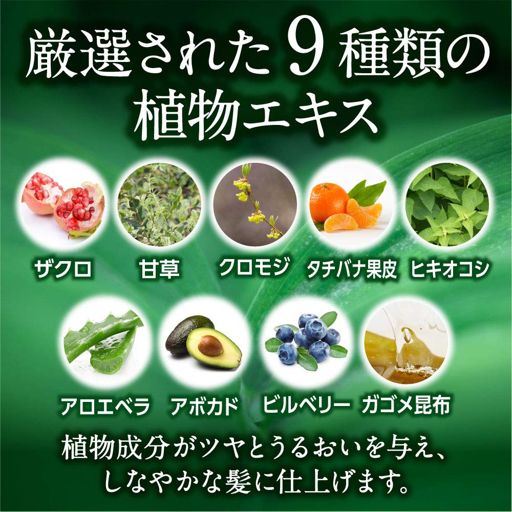 [Девять тщательно отобранных растительных экстрактов] Растительные ингредиенты придают блеск и увлажнение, делая волосы эластичными. (Гранат, солодка, куродзи, кожура татибаны, хикиокоси, алоэ вера, авокадо, черника, ламинария гагоме) [Приверженность отсутствию добавок] Без ПАВ на основе нефтепродуктов, синтетических отдушек, синтетических красителей, силикона, минерального масла, парабенов, пигментов на основе каменноугольной смолы, антиоксидантов, УФ-абсорбентов, синтетических полимеров (без силикона, без отдушек)