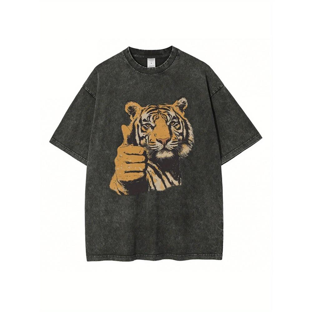 Тяжелые хлопковые футболки Четыре сезона Универсальная носка Графика с большим пальцем тигра Потертая выстиранная футболка