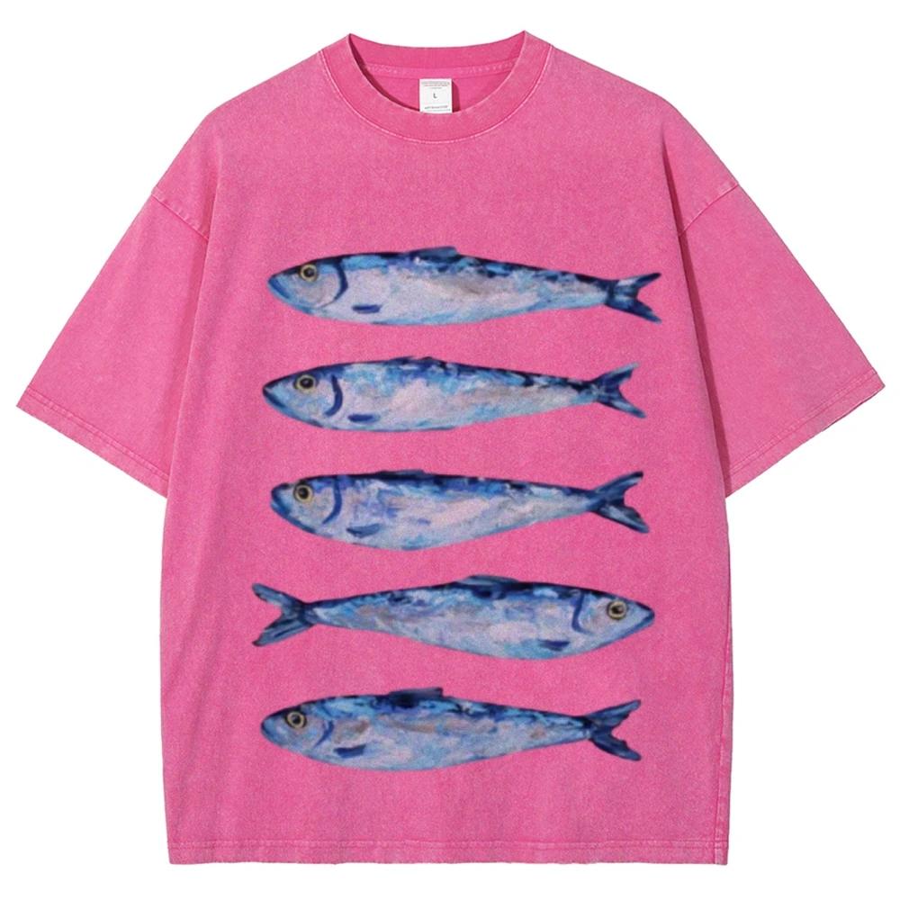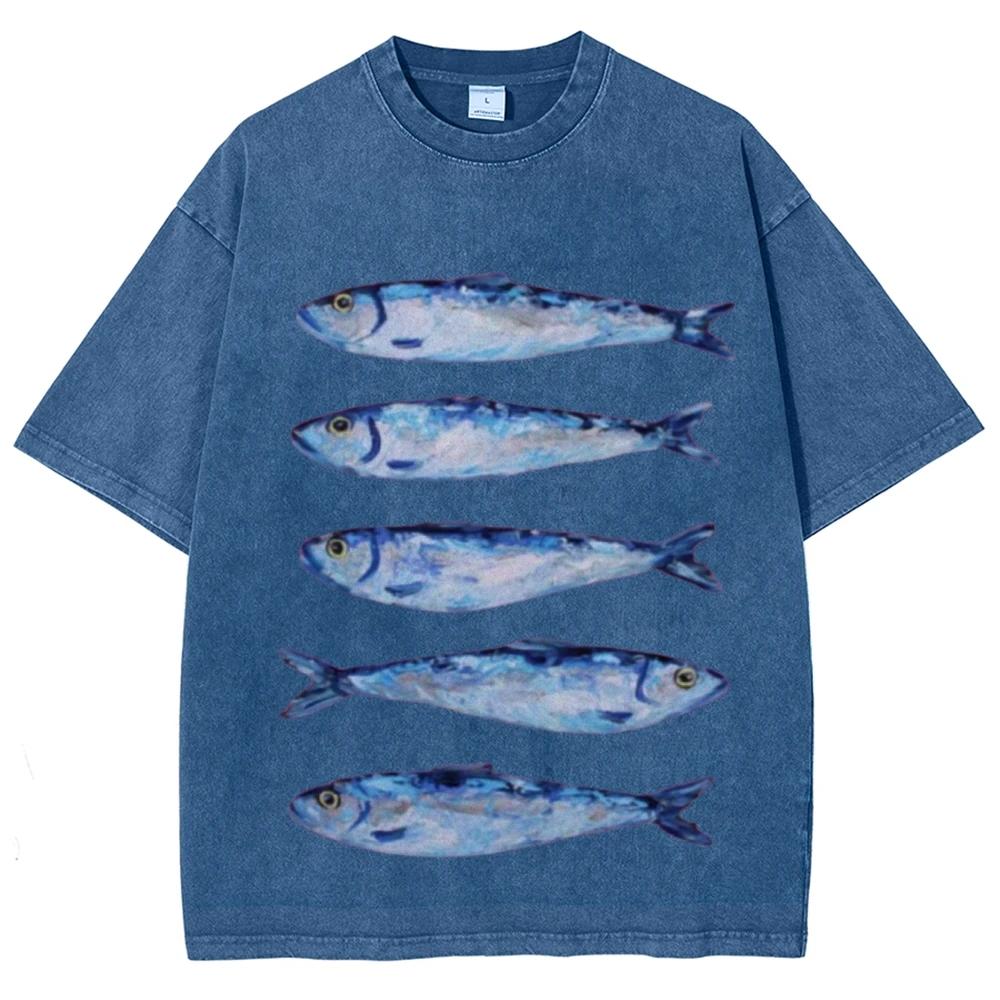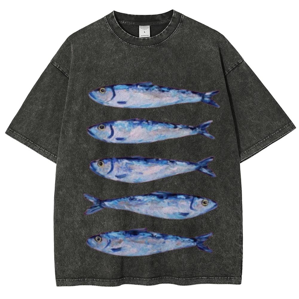 Интересная футболка с рисунком сардины, ретро, винтажная, с эффектом стирки водой, с коротким рукавом, мужская и женская, свободного уличного стиля, модный топ