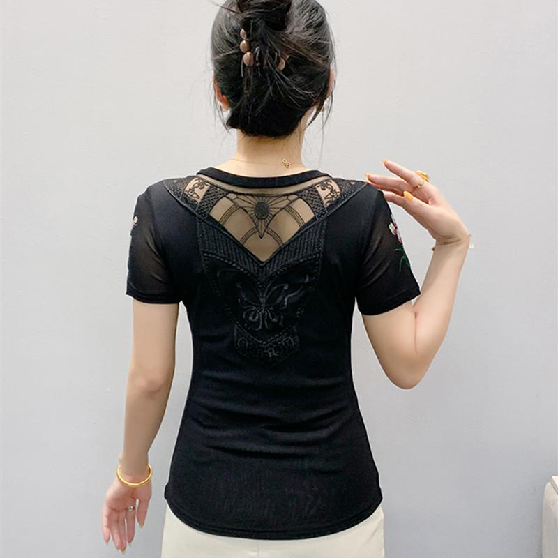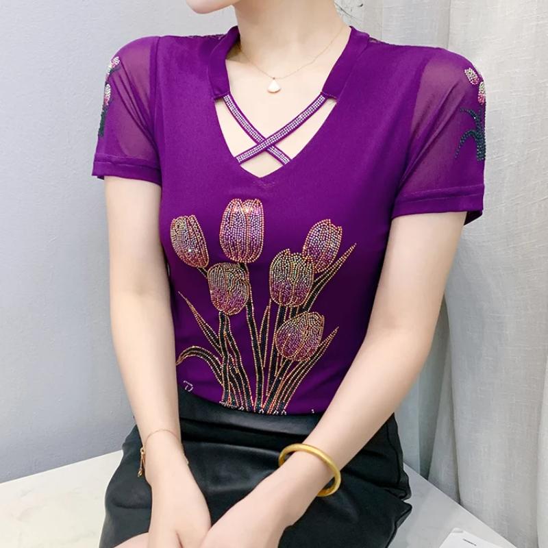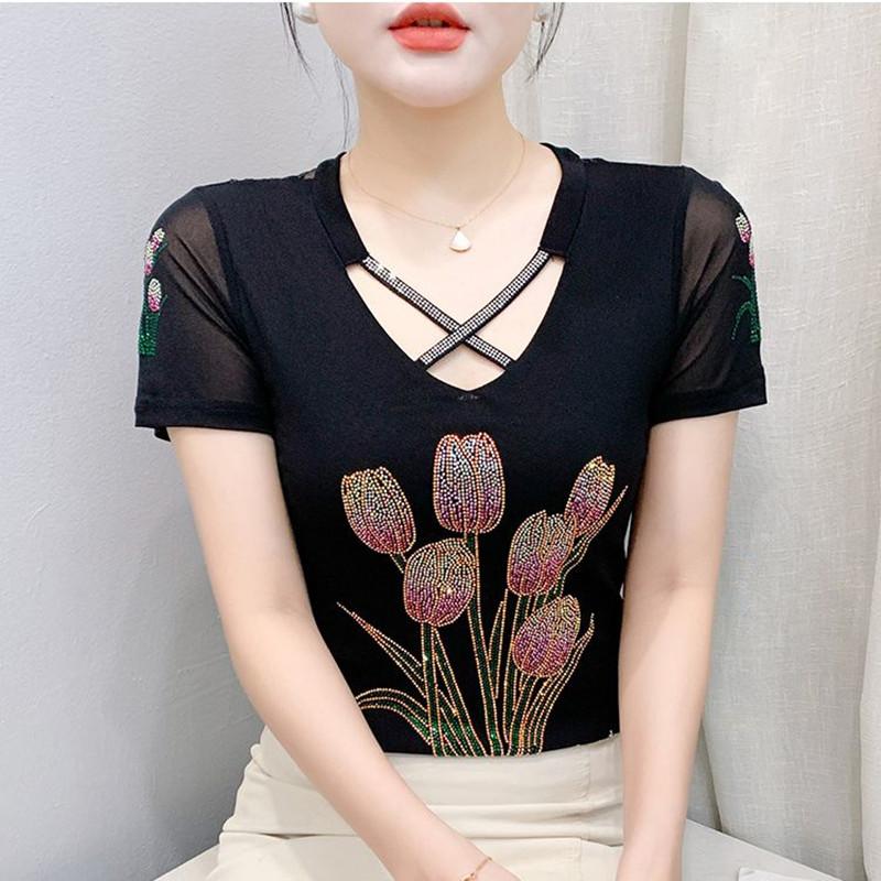 Лето Новая Мода Корейская Одежда Женская Футболка Роскошный Цветок Горячие Бриллианты Футболки Сексуальная Уличная Одежда Девушки Приталенные Топы с Коротким Рукавом